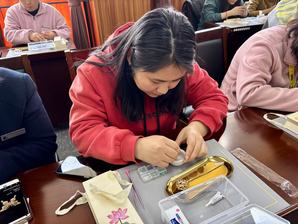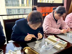 活动在轻松惬意的氛围中正式开启,在专业老师耐心细致地讲解与示范后,大家兴致勃勃,她们手持镊子、剪刀等工具,依照精心构思的图案,小心翼翼地剪裁螺钿薄片,再将其精准无误地镶嵌在器物表面,完成螺钿的初步造型搭建。这一过程,看似并无太多复杂之处,实则需要一定的耐心与专注。她们沉浸其中,眼神专注,全身心投入。完成镶嵌后,根据个人的审美偏好,挑选色彩各异的颜料,精心地为螺钿上色。