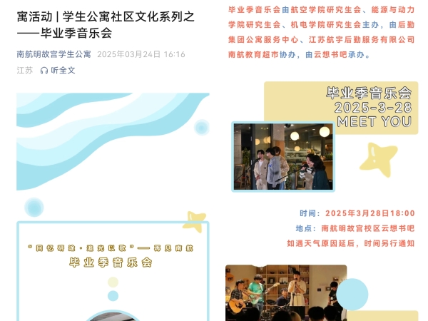 “告别并非结束,山水总会相逢”,3月28日晚,由航空学院、能源与动力学院、机电学院研究生会主办,公寓服务中心、南航教育超市协办,云想书吧承办的“回忆研途,追光以歌”2025毕业季音乐会在明故宫校区云想书吧举行。来自各学院的同学以及公寓服务中心阿姨大叔们,用动人的旋律为即将离校的毕业生们编织了一张星光熠熠的回忆网。