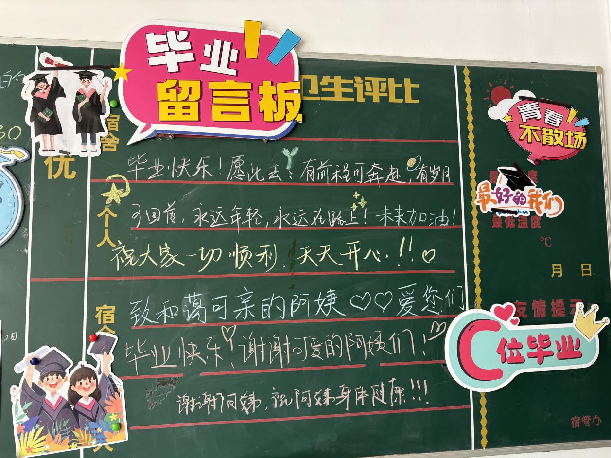 走进和园35栋学生公寓,留言墙被公寓阿姨精心布置成“时光长廊”。毕业生们用彩色粉笔写下“毕业感言”。既有“感谢宿管阿姨每天清晨的第一声问候”的暖心致谢,也有“室友、同门一起上学一起出游”的趣味回忆;既有“研途有你,顶峰相见”的挚友约定,更有“此去繁花似锦,归来仍是少年”的壮志宣言。