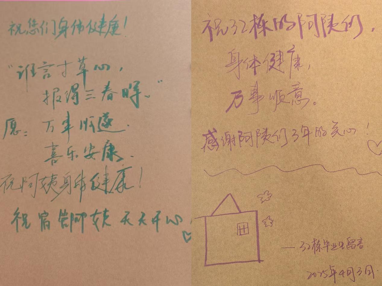 馨园32栋的毕业生将自己对未来的展望与对阿姨的不舍浓缩成一页页手写信。“祝32栋的阿姨身体健康、万事如意”“感谢阿姨们这三年的照顾,再回南航,一定来看你们!”……南航求学数载,日复一日,从晨光熹微到暮色四合,从夏树葱翠到岁暮天寒,公寓阿姨们以一寸方桌,守候着莘莘学子。收到这些留言,公寓阿姨们也纷纷表示真的非常感动,祝愿即将展开人生新篇章的毕业生们,未来的生活中,能够一直保持积极向上的心态,勇于拼搏,努力奋斗,收获成功!无论身处何方,不要忘记母校的温暖!