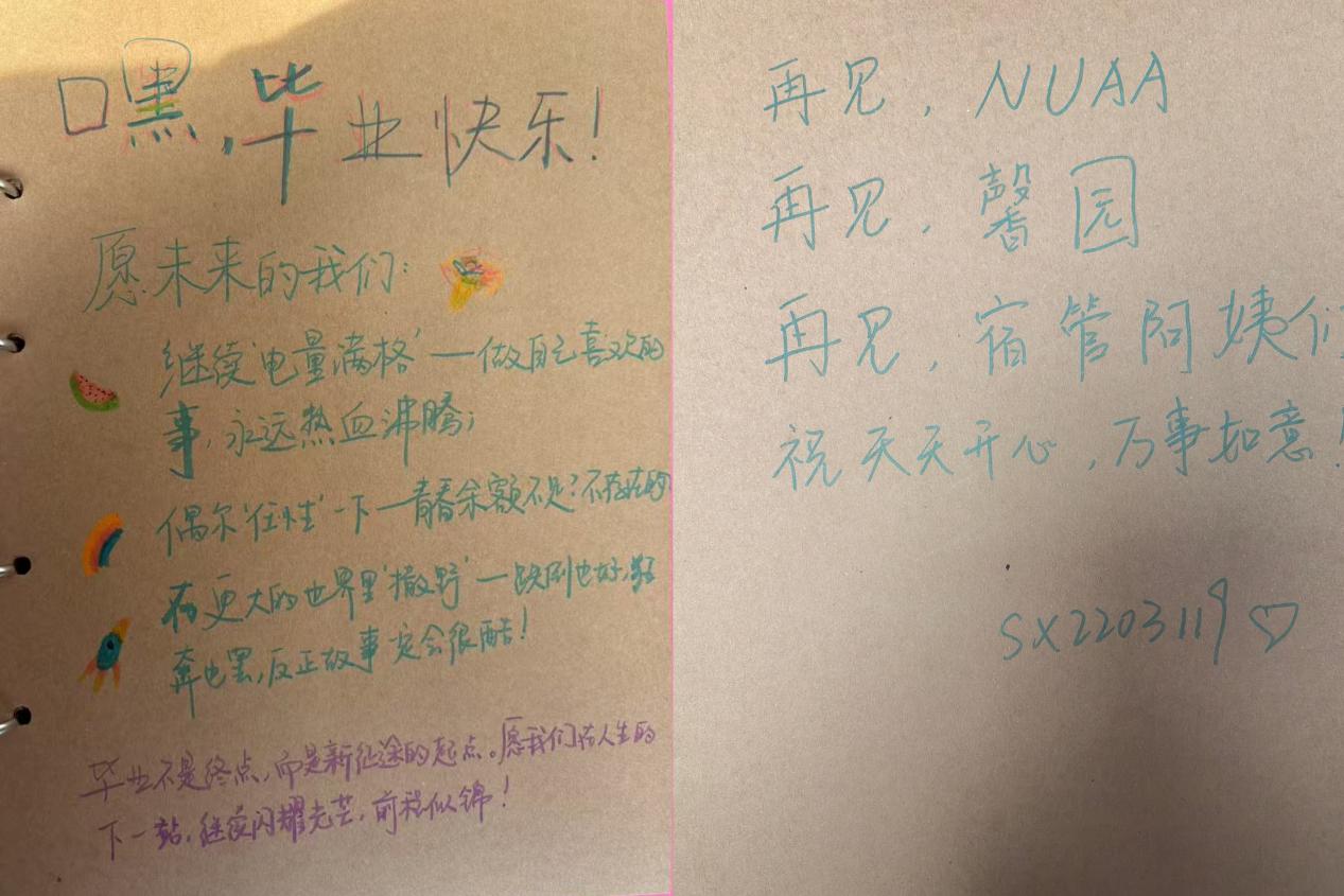 2022级硕士研究生毕业季期间,公寓服务中心举办了“纸短情长·青春留痕”活动,为毕业生们准备了留言墙和纪念册,记录他们在南航公寓的美好回忆。