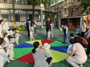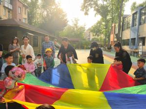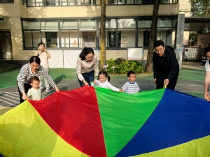 亲子游戏让现场变得更加有趣,孩子和家长们随着音乐节奏,在老师的引导下进行好玩的“彩虹伞”韵律游戏。他们笑声不断,沉浸在游戏中,享受着美好的亲子时光,感受到幼儿园活动的丰富多彩。
