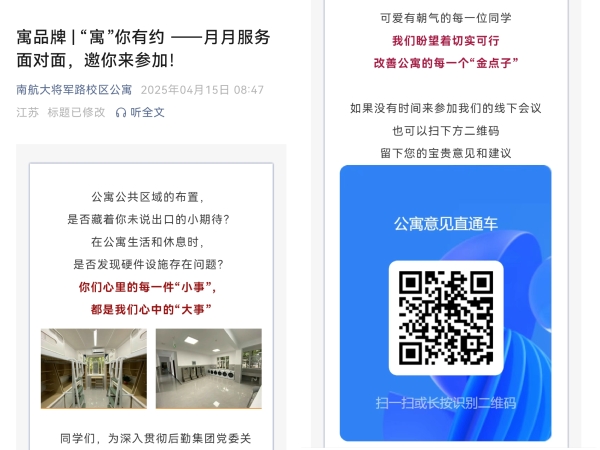 在座谈会筹备期间,公寓服务中心充分利用两校区公寓微信公众号,面向全校师生广泛征集意见建议,旨在围绕学生在公寓生活中的各类问题进行充分交流,一起“开放耳朵听真话,开放思路解难题”。