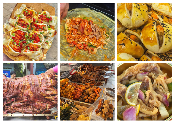 美食展销活动现场人头攒动,食堂精心准备的美食琳琅满目,让师生们大饱口福。其中,龙虾小笼包备受青睐,皮薄馅大,每一口都饱含着龙虾的鲜美;龙虾牛角包造型别致,酥脆的外皮与鲜嫩的龙虾肉相得益彰,口感层次丰富;烤全羊更是展销现场的热门菜品,整只羊被烤至外皮金黄酥脆,吸引了众多师生前来品尝。此外,现场还有各类炸串、鲜榨果汁、精致甜品等丰富美食,满足了师生们多样化的口味需求。