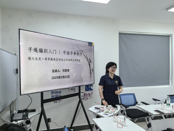 活动现场,公寓服务中心早早准备了五彩编绳、水晶珠、流苏配件等材料,自学成才的“编织达人”——公寓管理员万雯卿作为讲师现场和同学们分享编绳知识和技巧。“五彩绳又称‘长命缕’,寓意祈福辟邪,是端午节的重要习俗之一……”座无虚席的课堂上,万雯卿首先引入端午编绳的文化渊源,并讲解了中国结的由来,从远古结绳记事到今时装饰艺术,每一道绳结都承载着文化的密码。随后,万雯卿一步步耐心示范编绳入门技巧。学生们兴趣盎然,认真学习,轻捻彩线,熟练演绎平结技法。玉线于他们的指缝间翩然翻飞,简约手链、萌趣挂件渐次成型。他们专注的眉眼与灵动的指尖,共同勾勒课堂最生动的风景。万雯卿说:“让学生们在经纬交错中触摸传统的温度,正是公寓社区课程的初心所在。”