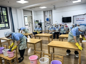 规范消杀,守护健康防线:在桌面消毒环节,老师们严格执行“清—消—清”标准化流程,精准配比消毒液浓度,细致讲解擦拭顺序与力度要点。她们动作娴熟流畅,每一步操作都严谨规范,将看似简单的消毒工作演绎成专业技能的生动示范,用实际行动筑牢幼儿健康安全的第一道防线。