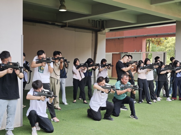 在国防体育活动阶段,体育部国防体育教研室主任刘海涛老师为学员们传授了国防体育教育的概念重要意义,依托真人CS战场将活动推向了高潮。学员们分为红蓝两队,化身战术小队,在掩体间展开攻防对抗。激烈的团队协作中,学员们打破部门壁垒,“包抄救援”“火力掩护”等战术配合让沟通效率直线提升。不少学员表示:“奔跑射击时各种压力一一抛掷脑后,结束后反而觉得头脑更清晰了!”
