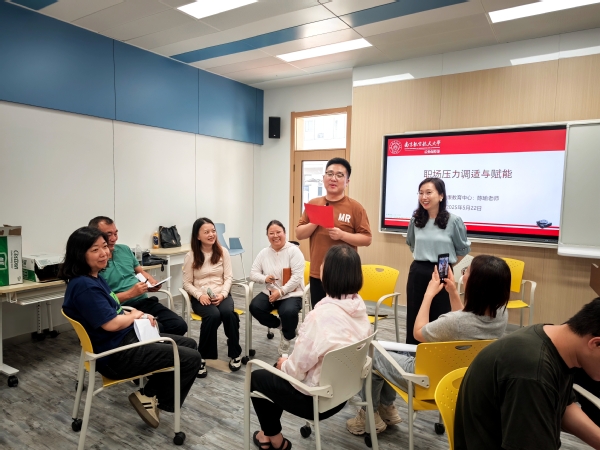 在《职场压力调适与赋能》课程阶段,校心理健康教育中心陈瑜老师通过“抢椅子分享秘密”“压力画像”等互动游戏,活跃现场氛围、引导员工可视化自身压力源;通过“压力漂流瓶”环节鼓励大家分享生活职场中的压力困惑。活动现场,不同小组互换压力便签针对性出谋划策与分享解压技巧。此次培训让参与者逐步掌握了情绪管理、压力拆解等实用技能,现场氛围从拘谨转向热烈,多人坦言“第一次直面压力,反而感觉轻松了许多”。