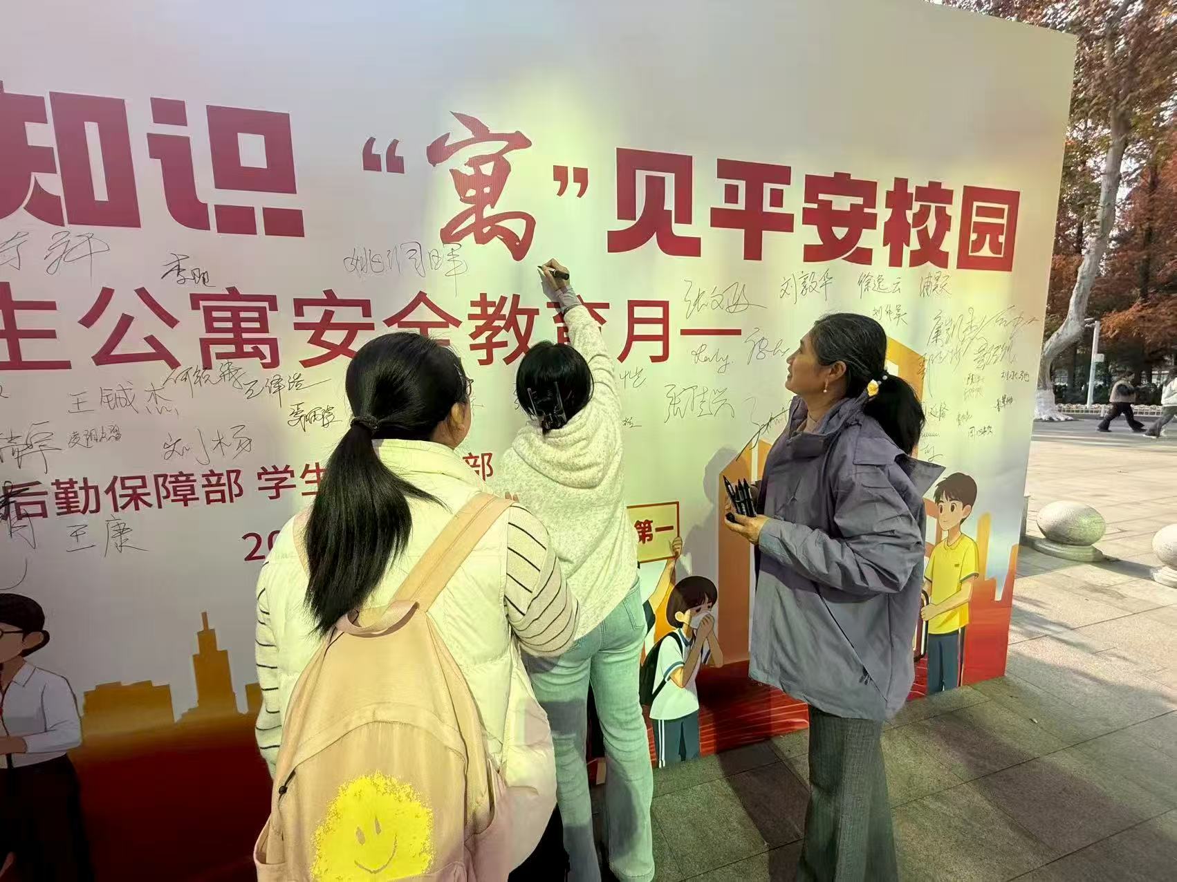 现场活动中,四大特色活动区错落排布,以全方位、多角度的宣传教育形式吸引同学们驻足参与。违章电器展示区采用红色警示色调,将电热毯、取暖器、非新国标接线板等常见违规电器和新型不安全用电现象分类陈列,每款电器旁均配有详细标牌,清晰标注危险系数及典型事故案例,直观揭露违规使用各类电器的安全隐患。消防安全演示体验区内,校保卫处消防科工作人员现场讲解灭火器、消火栓、防火毯等公寓内各类消防设备的工作原理,细致讲解操作流程与注意事项,同学们分组上阵,在专业指导下体验各类消防器材的使用方法,将理论知识转化为应急技能。游戏互动区成为整场活动的焦点,“安全隐患大搜查”小游戏以宿舍实景照片为载体,同学们在限定时间内排查隐形隐患、阐述整改方案,在趣味比拼中提升安全辨识能力,“安全常识问答”以开放性题目激发思维碰撞,答题后的抽奖环节进一步点燃参与热情。“‘宿’说安全知识,‘寓’见平安校园”主题签名喷绘展板前,同学们郑重签下姓名,以庄严承诺践行安全责任,传递共建平安公寓的共同心愿。