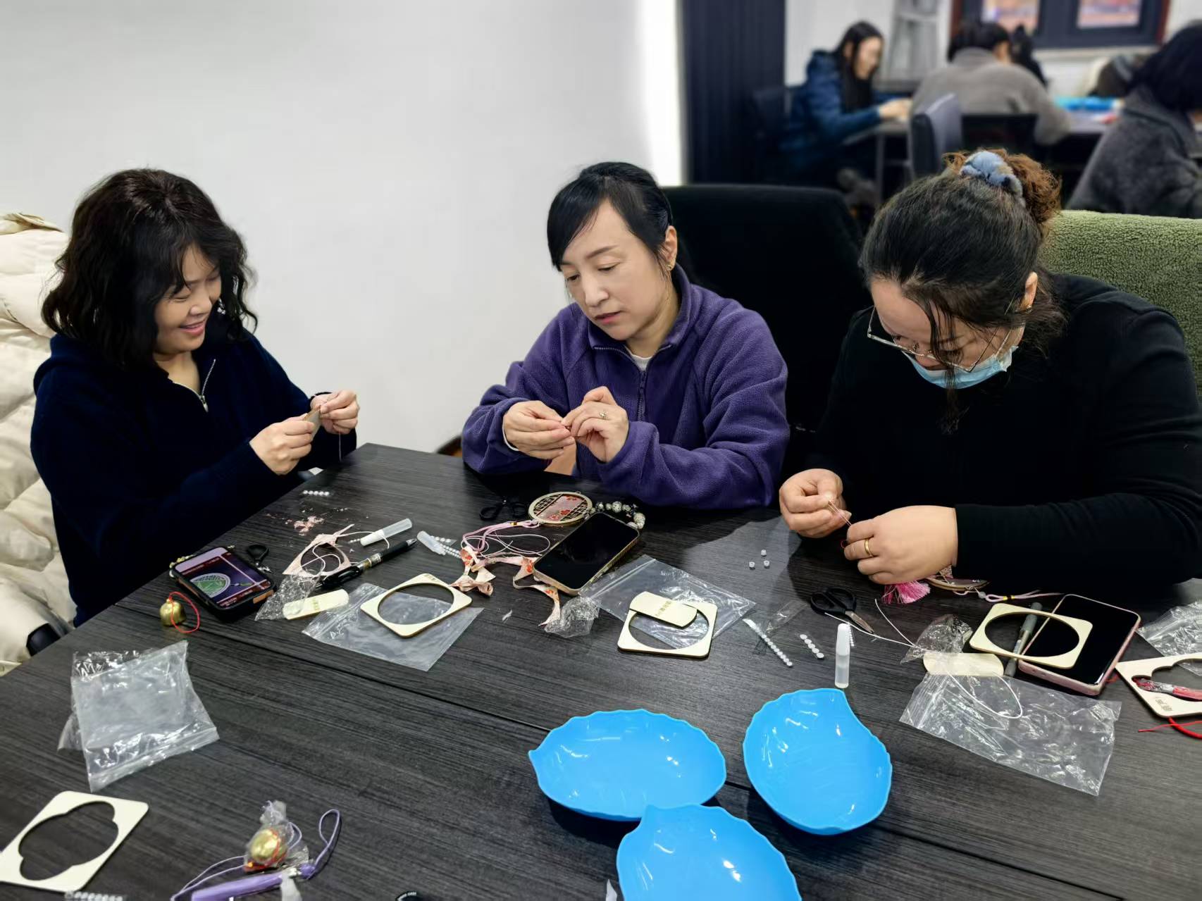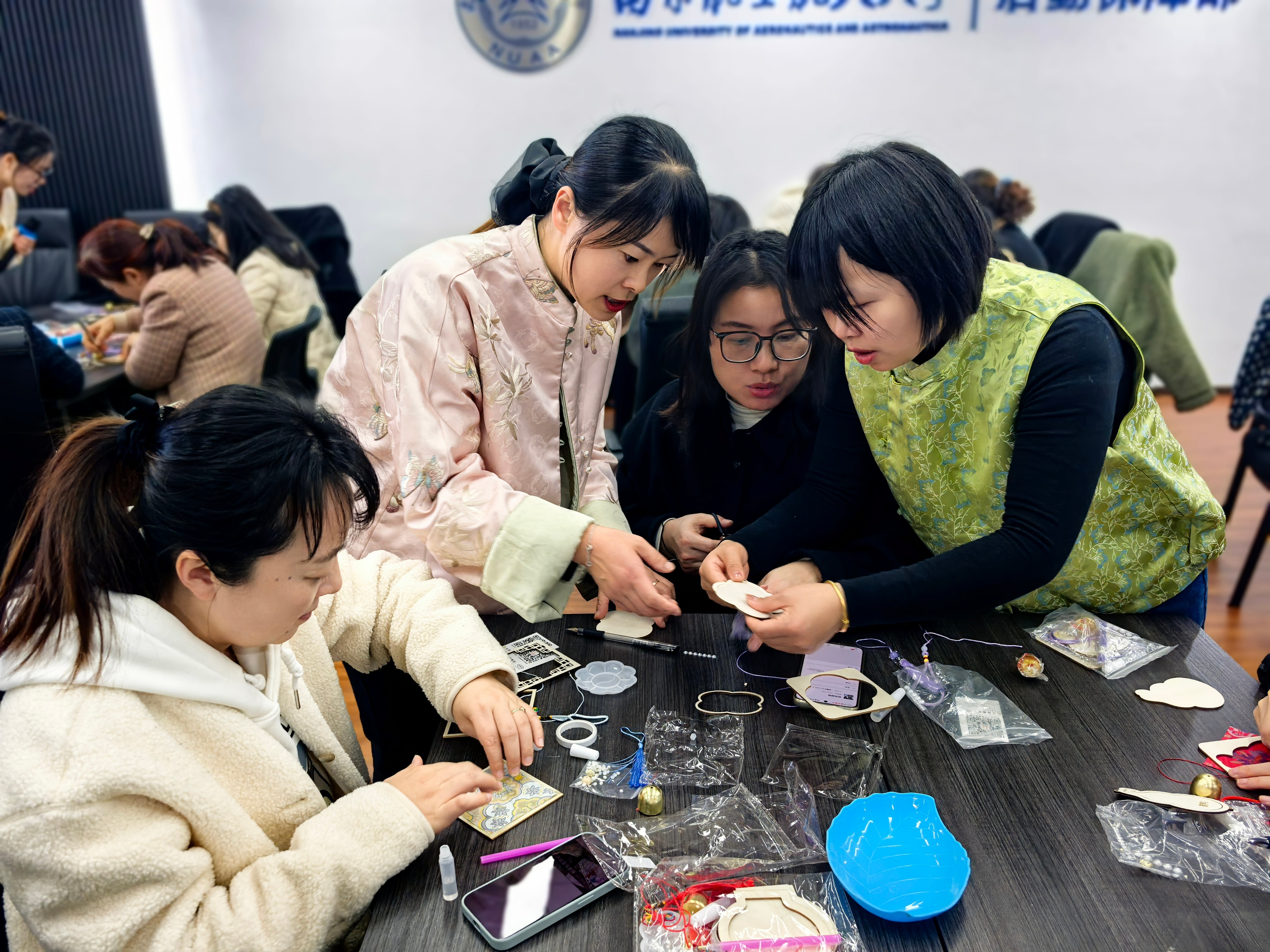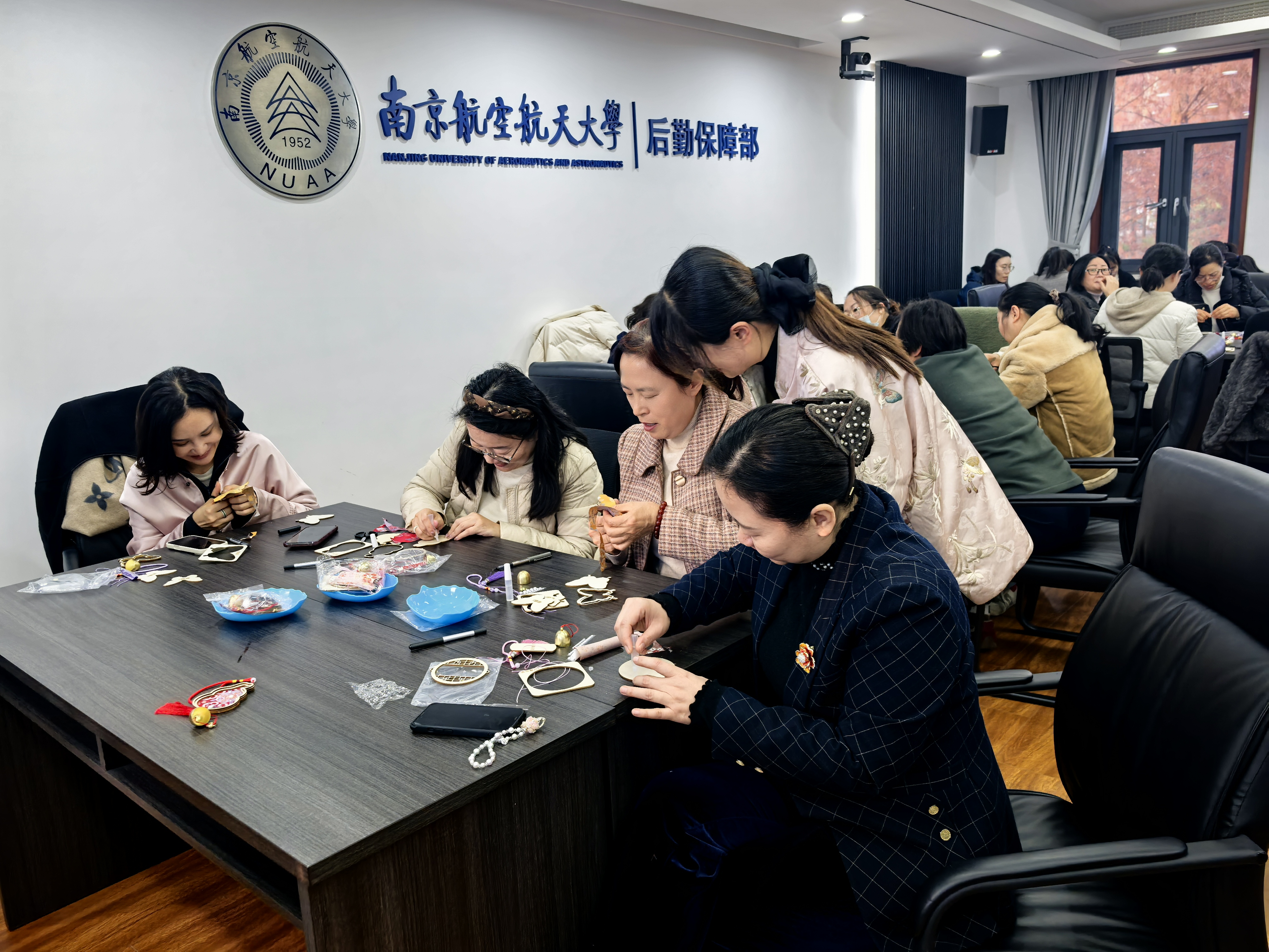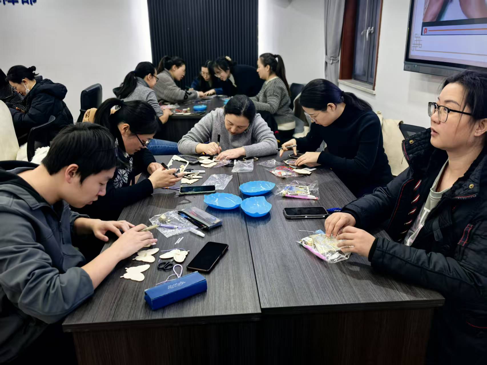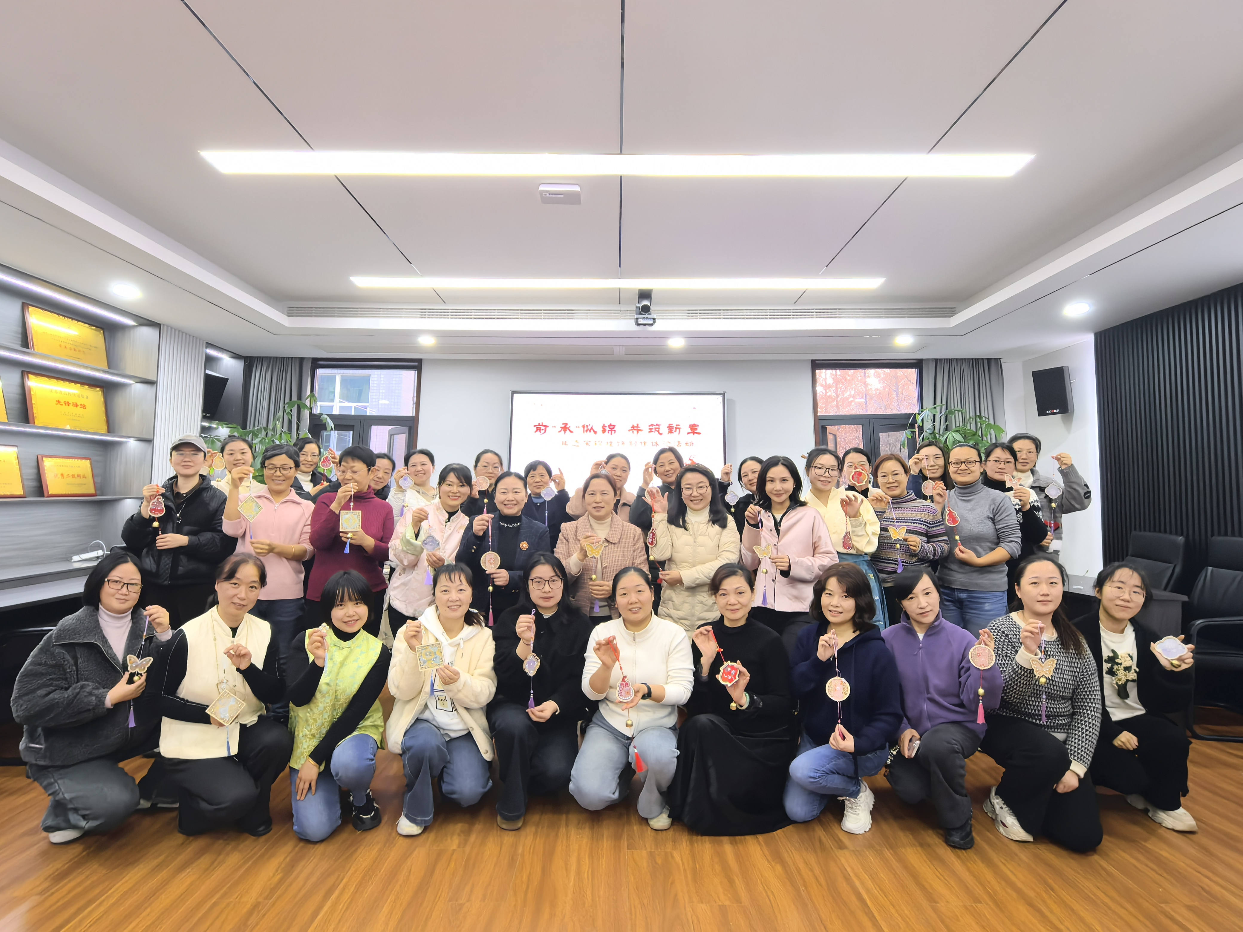 讲解结束后,大家手持精美的宋锦材料包与工具,开始专心制作。缤纷的丝线、精巧的配饰在指尖被赋予新的生命与故事,现场氛围温馨而专注。作品完成后,全体参与职工手持各自完成的挂饰合影留念,将这充满文化韵味的“锦绣”时刻永久珍藏。
