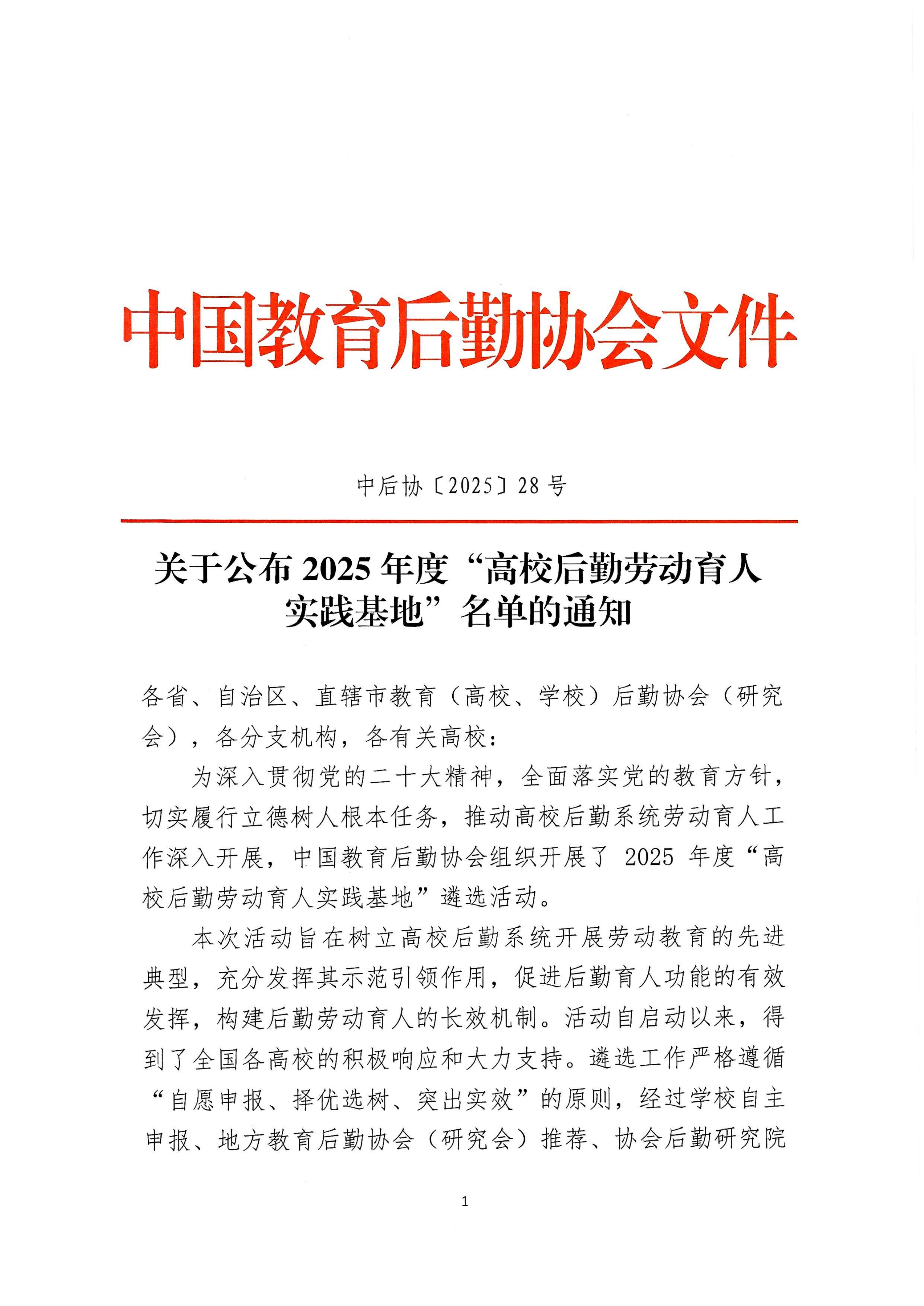 近日,中国教育后勤协会公布2025年度“高校后勤劳动育人实践基地”评选结果,我校凭借特色鲜明、成效显著的劳动育人实践,成功获评该荣誉称号。