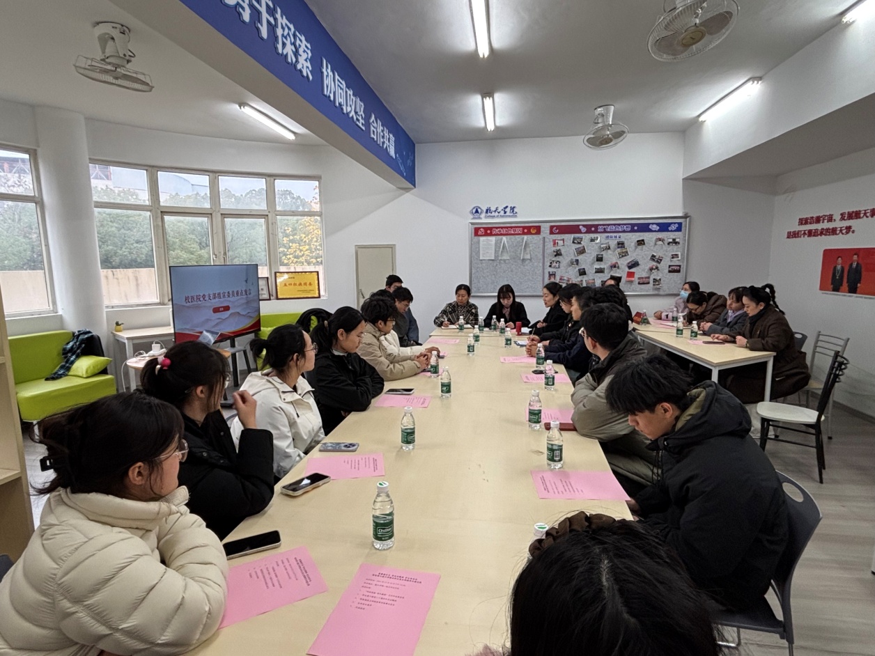 随后,党员们移步航天学院一站式学生社区展开座谈交流。学生骨干胡叶同学首先领学了二十届四中全会核心精神,她聚焦“以中国式现代化全面推进中华民族伟大复兴”的核心任务,结合航天与医疗领域的使命担当,阐释“科技自立与躬身奉献相结合”的实践路径:既要以刻苦钻研、攻坚克难的决心突破“卡脖子”技术,响应科技自立自强号召;也要坚守人民至上理念,以医疗服务与航天事业的坚守保障国家发展、惠及全体人民;更要统筹发展和安全,践行航天“零差错”、医疗“零容错”的严苛标准。接着,校医院党支部组宣委员程炜同志结合医疗工作实际,从把握二十届四中全会精神实质,把稳思想之舵,筑牢政治根基;从如何守护精神健康;如何通过实际工作夯实医疗保障基石等三个方面跟全体党员分享了学习全会精神的感悟,讲述了如何将全会精神转化为守护师生健康的具体行动。座谈交流接下来的内容,是医院护理部主任李宇同志向同学们做生命健康教育,李宇同志围绕校园结核病、艾滋病等传染病防控知识,从传播途径、预防措施到应急处置进行了详细讲解,强调了学生身体与心理健康的重要性,全方位提升学生党员的健康防护意识与自救互救能力,将“护生命安全”的主题落到实处。同时,还简单介绍了校医院的科室设置、专家门诊、业务开展及健康宣教等情况,方便同学们就近医疗。