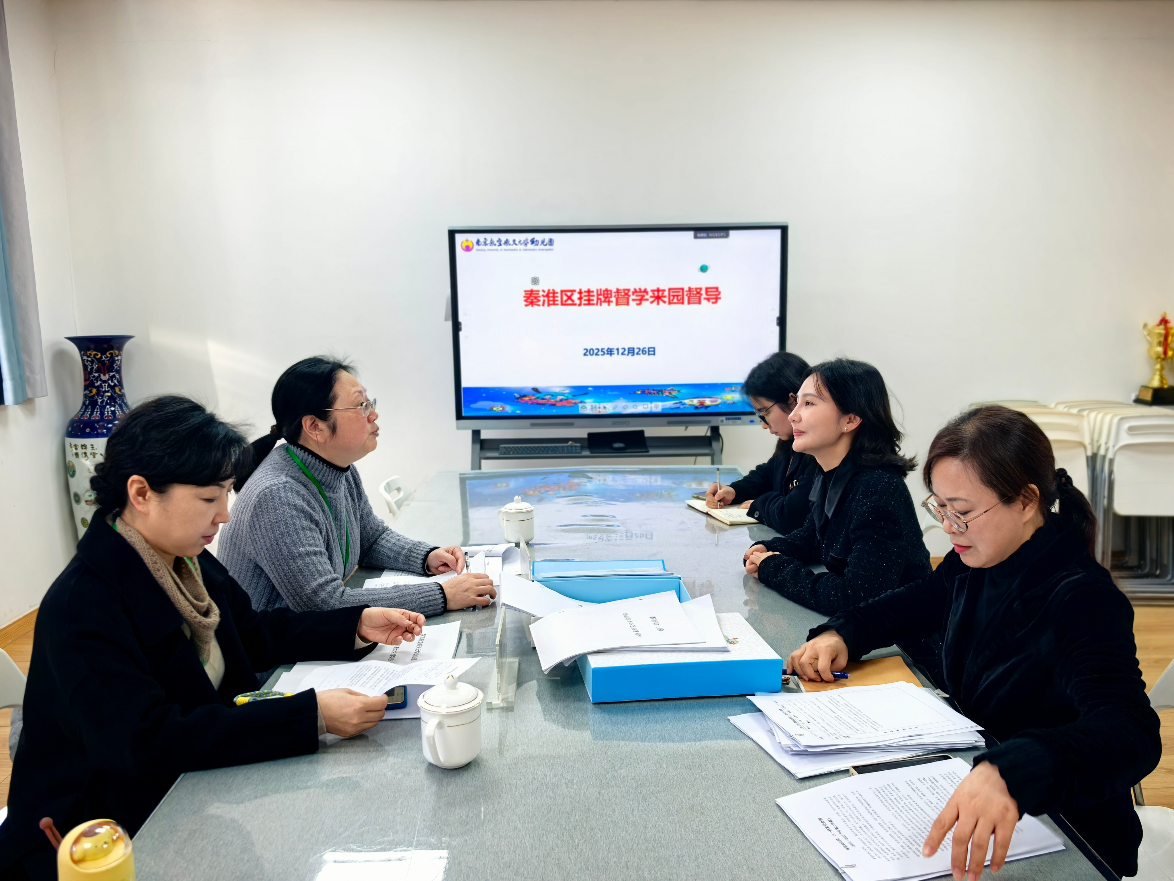 为深入贯彻落实党的二十大精神,严格执行教育部相关文件要求,12月26日,秦淮区责任督学张莉君、刘珍艳来到南航幼儿园,围绕依法办园与民主管理、2025年度问题清单整改落实、挂牌督导工作交流等内容开展专项督导。