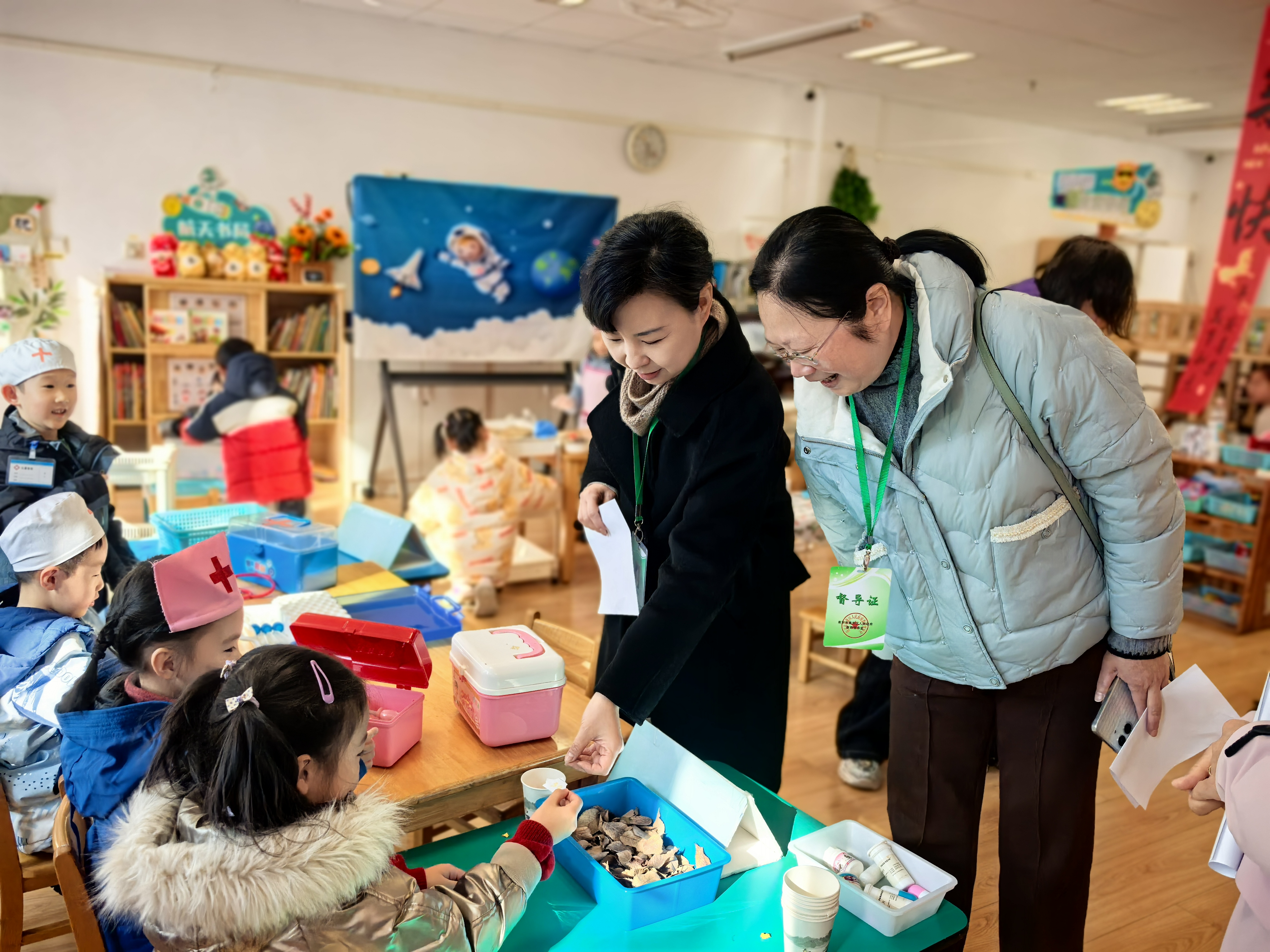 督导过程中,督学们首先深入班级,实地观摩幼儿游戏活动,重点考察区域布局、游戏材料投放等课程游戏化落地实效;同时巡视全园环境,细致察看活动过程中教师针对幼儿视力保护的具体实践举措。幼儿积极投入、快乐游戏的生动场景,赢得了督学们的高度赞扬。