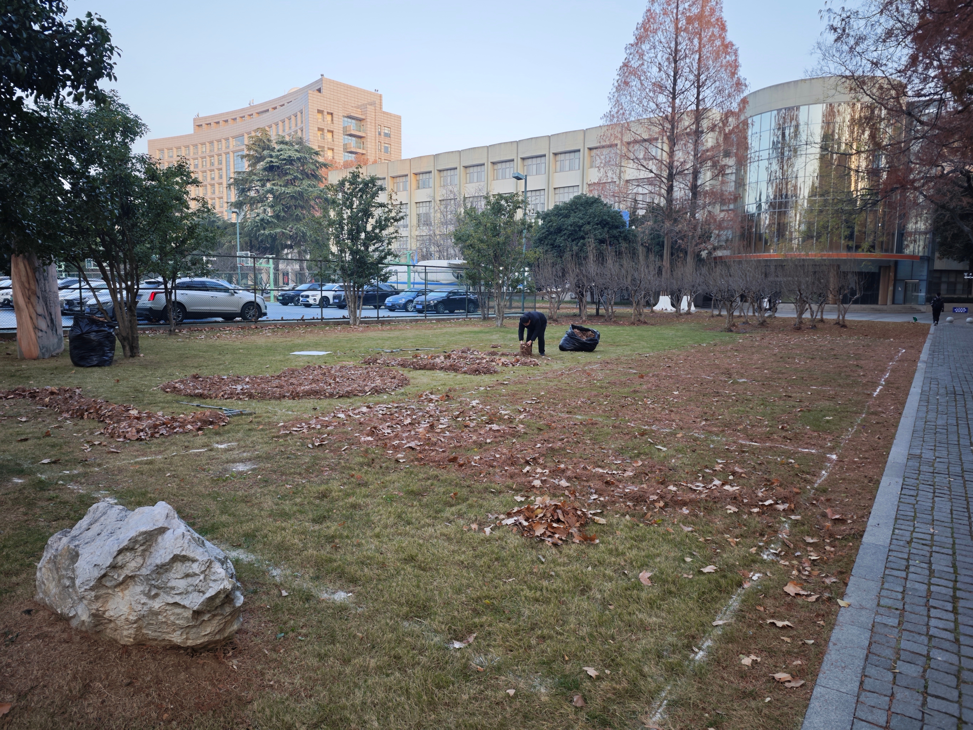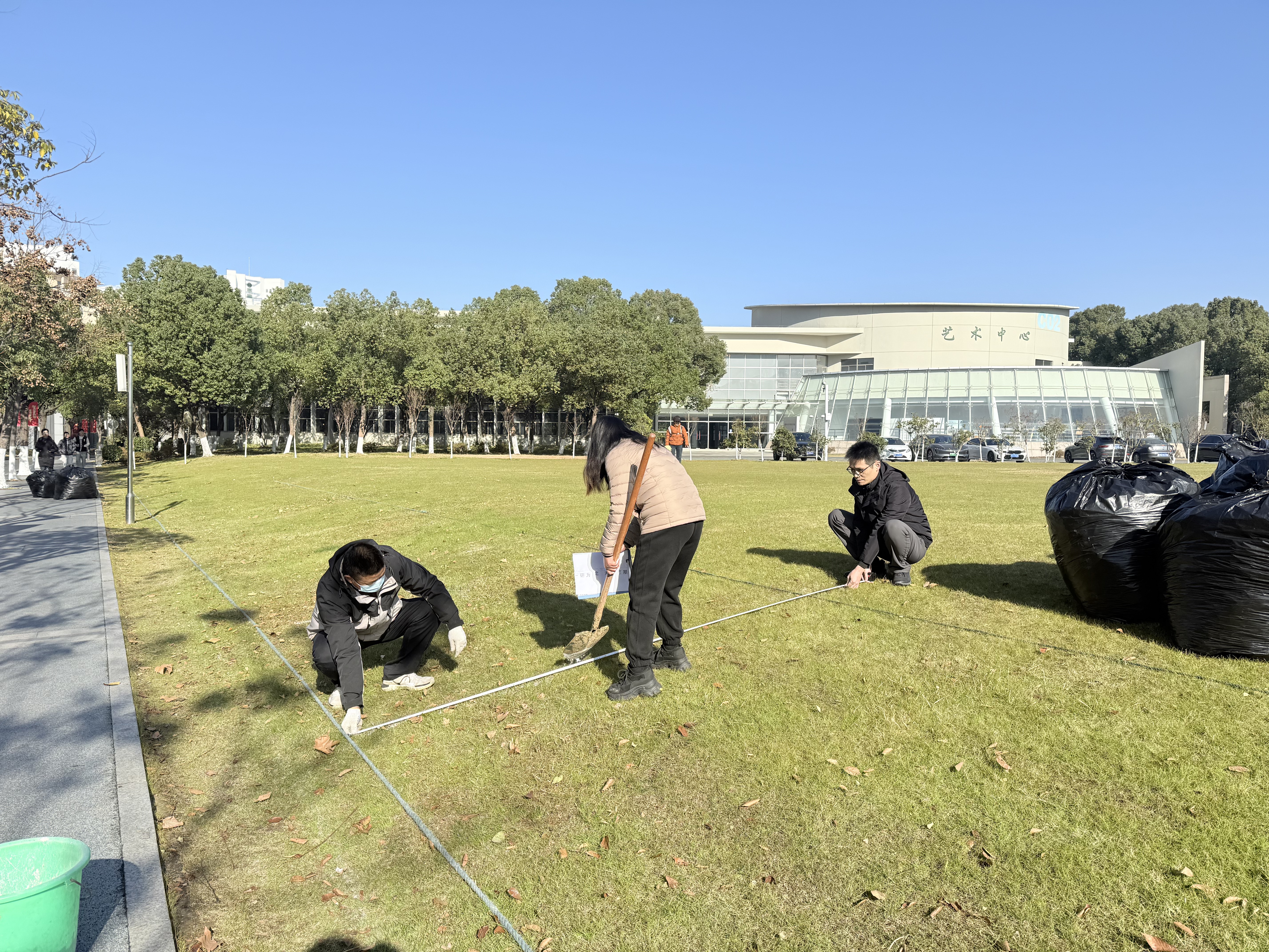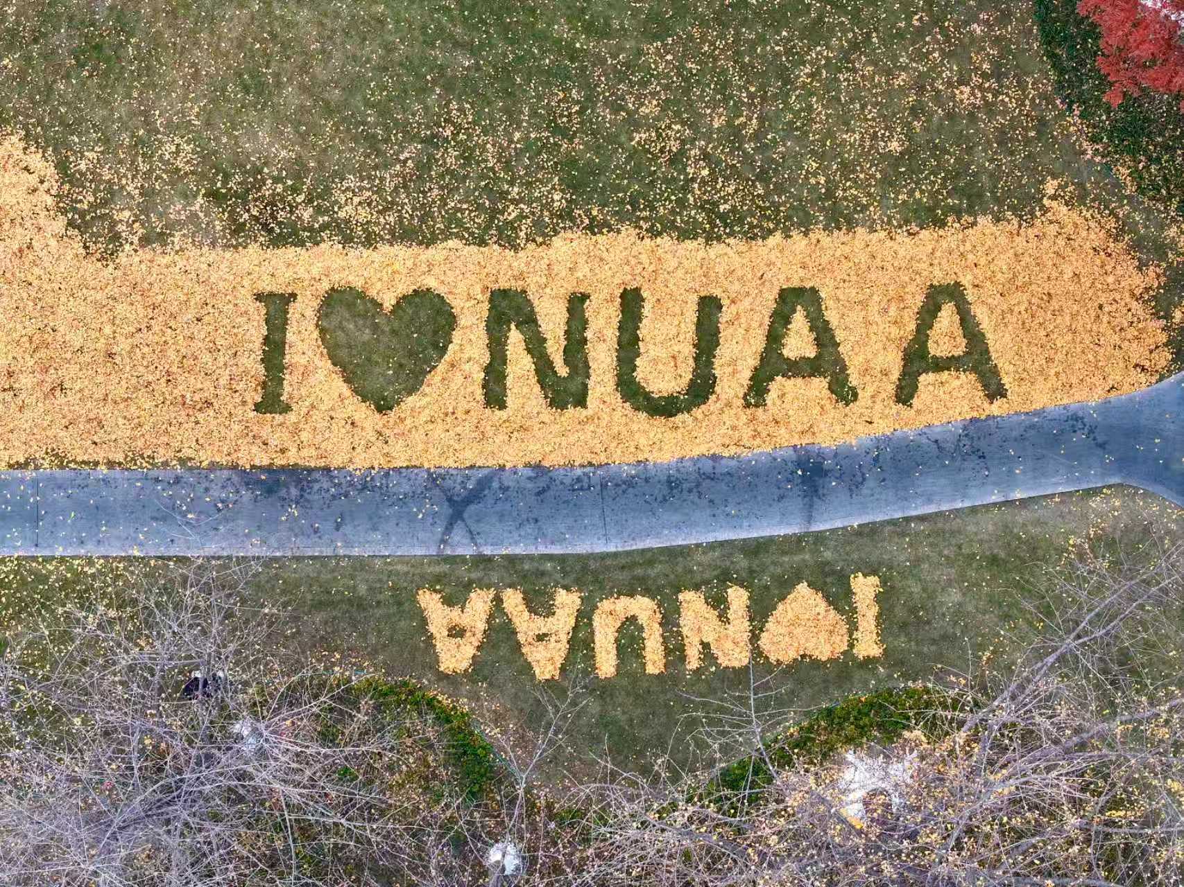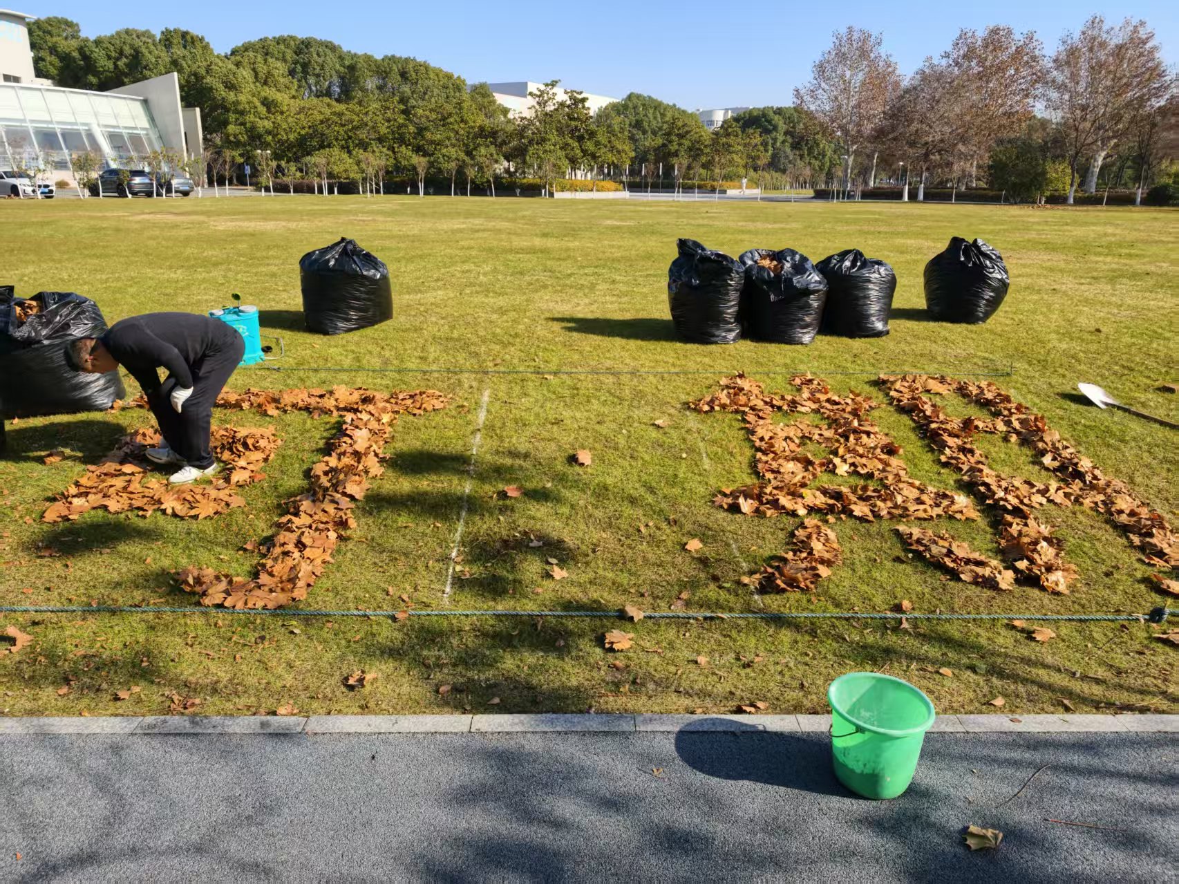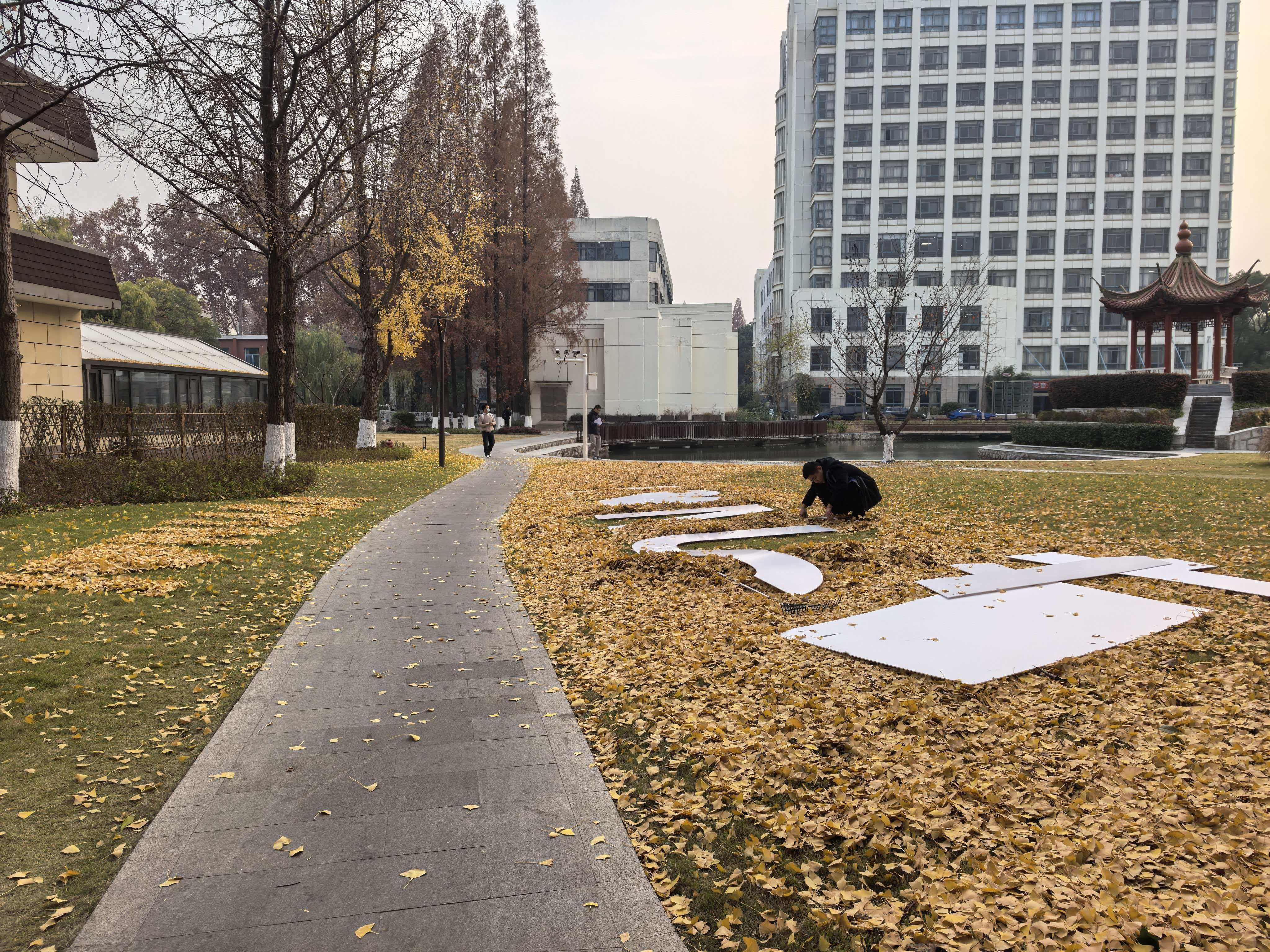 为确保呈现出最佳视觉效果,中心提前部署、周密筹备,充分结合两校区环境风貌与场地条件,反复推敲论证,确定摆字位置与尺寸规格,安排人员筛选形态完整、色泽均匀的银杏叶、法桐叶等落叶,加班加点完成收集、分拣、整理等全流程工作。摆放过程中,大家分工明确,密切协作,以精益求精的态度打磨每一个环节,最终一幅幅构思精巧的落叶作品跃然眼前,将秋冬校园的生机与诗意展现得淋漓尽致。
