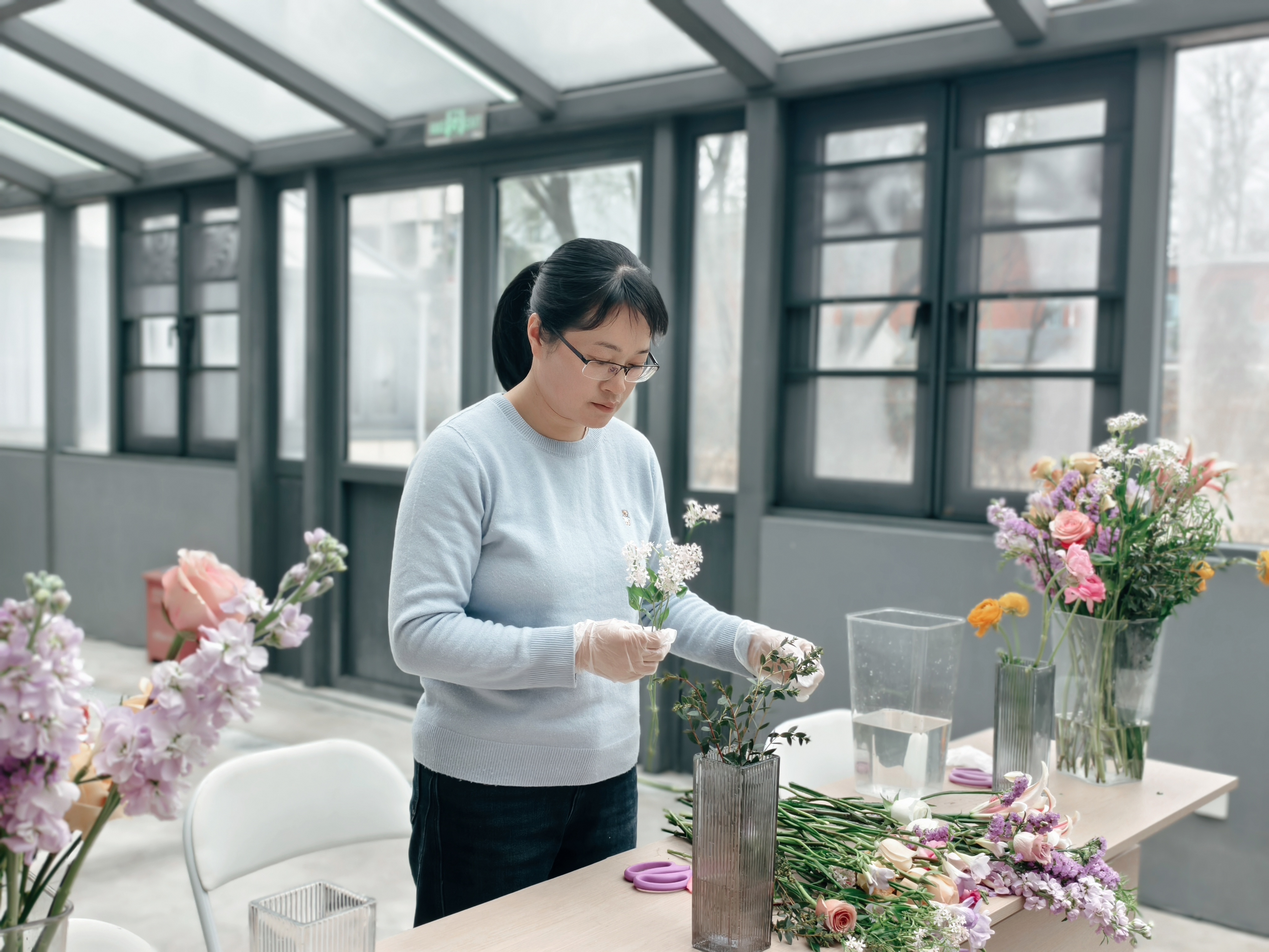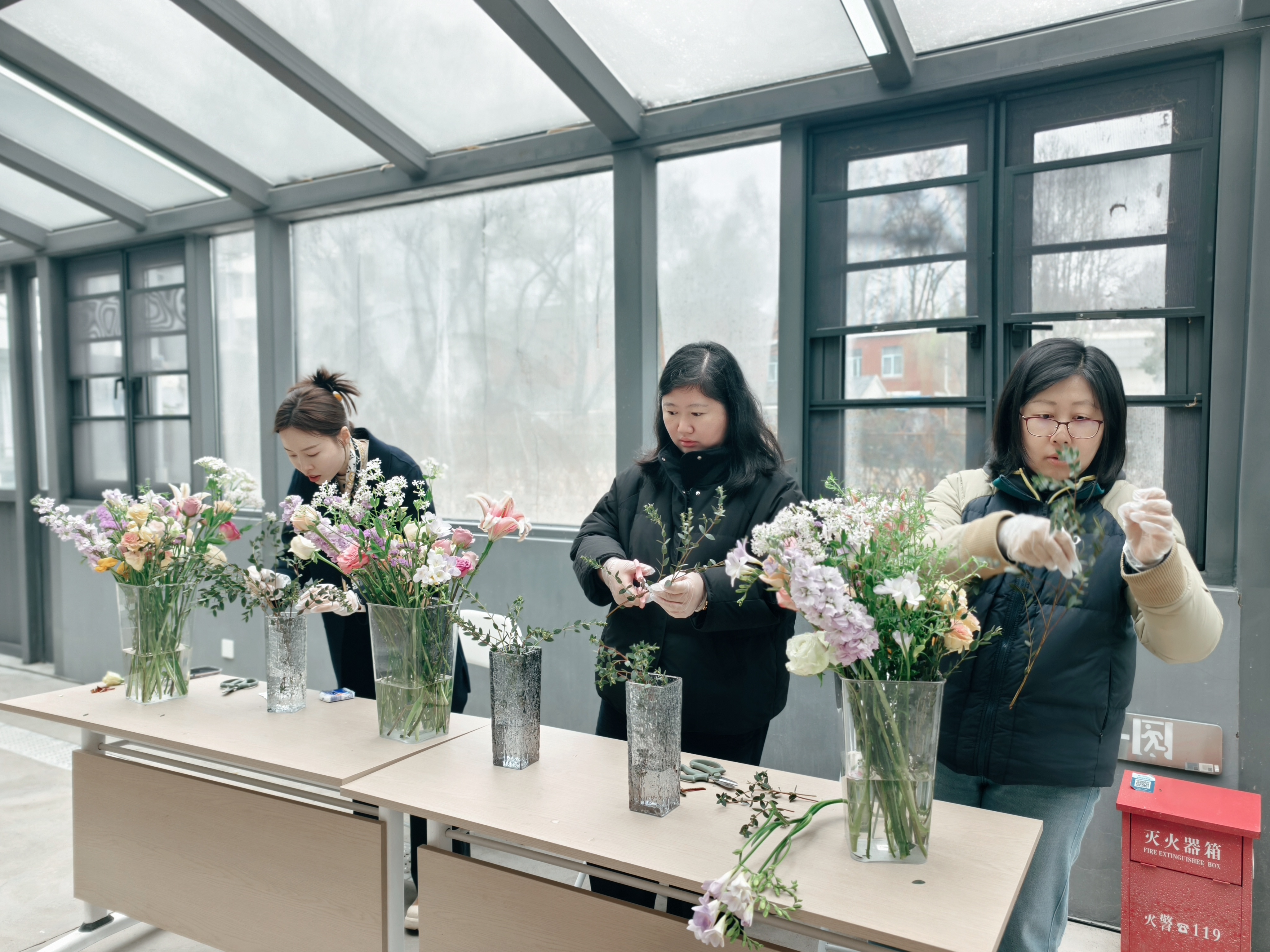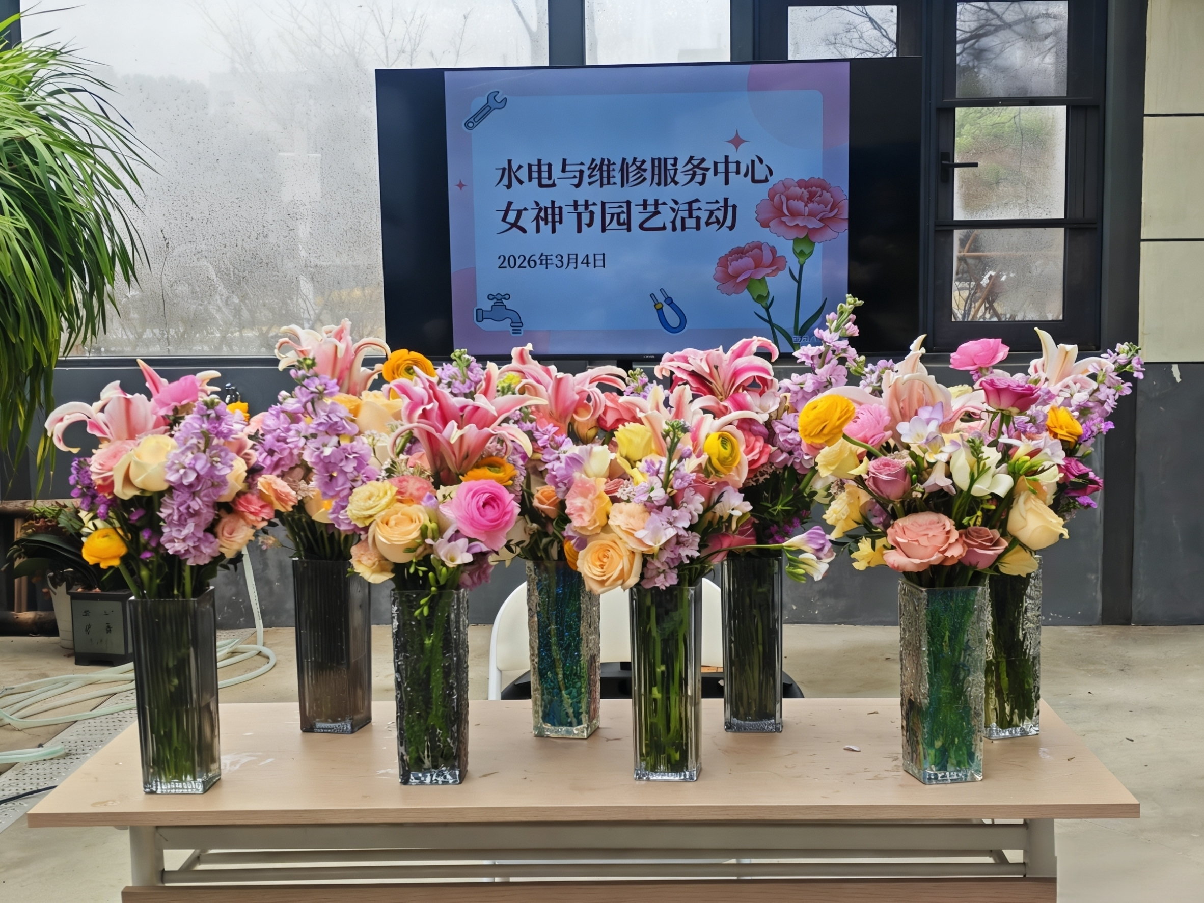 为庆祝第116个“三八”国际妇女节,营造尊重、关爱女性的校园氛围,丰富中心女教职工的文化与业余生活,提升艺术修养与生活情趣,水电与维修服务中心于3月4日上午在明故宫校区花房组织开展了园艺插花活动。