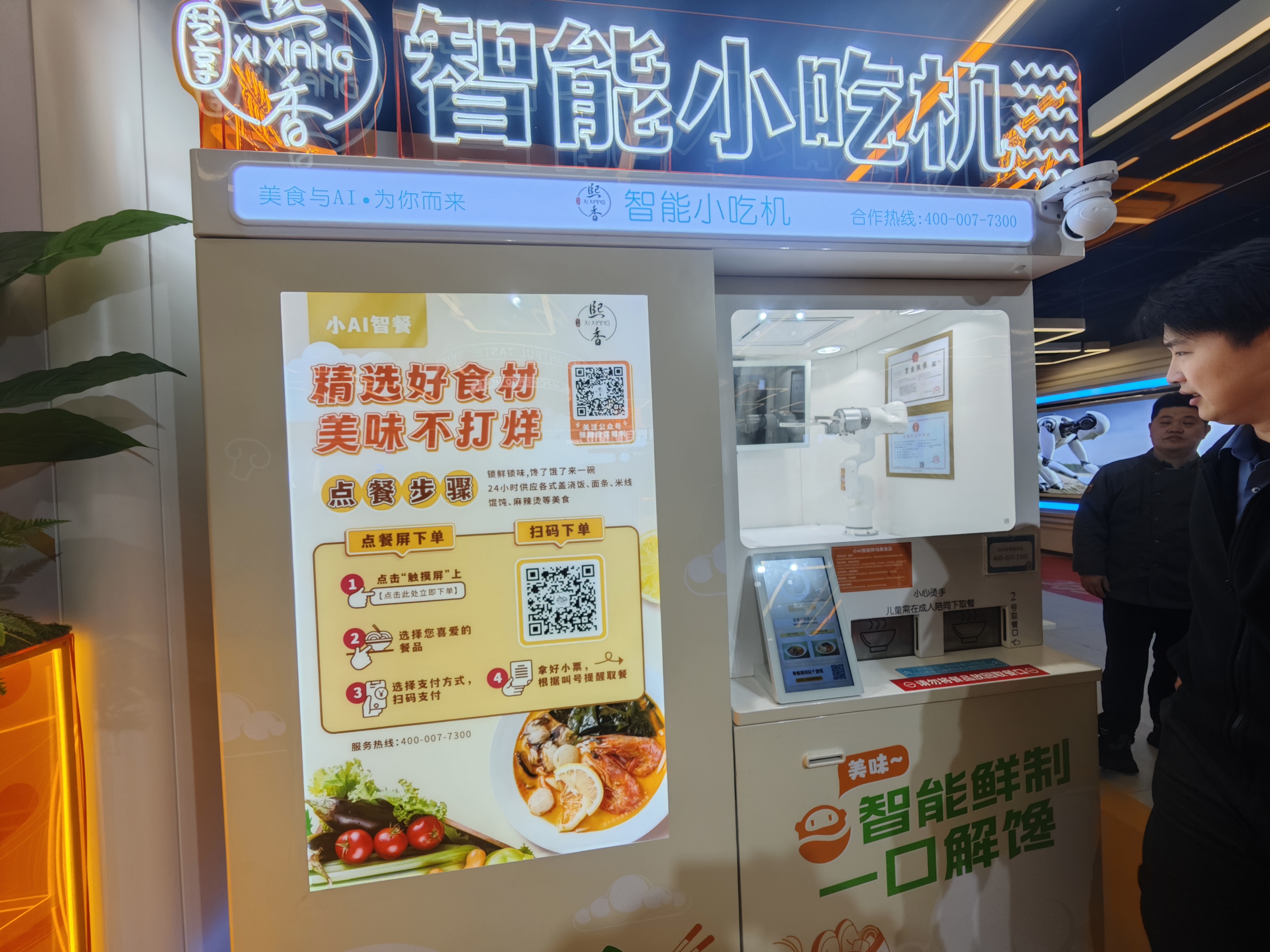 在工作人员的引导下,调研团队重点考察了AI后厨、智能小吃机、智慧面档、智能咖啡机等核心设施。餐厅依托“AI+物联网”技术,实现了数字化管理、无人化烹饪和智能化出餐的全流程覆盖。例如,智慧面档通过机械臂自动和面、压面,AI算法精准控制煮面时间,2分钟内即可完成出餐;智能小吃机支持24小时运营,提供小炒牛肉饭、川香麻辣烫等多样菜品,利用急速冷冻锁鲜和智能烹饪技术保障餐品品质。