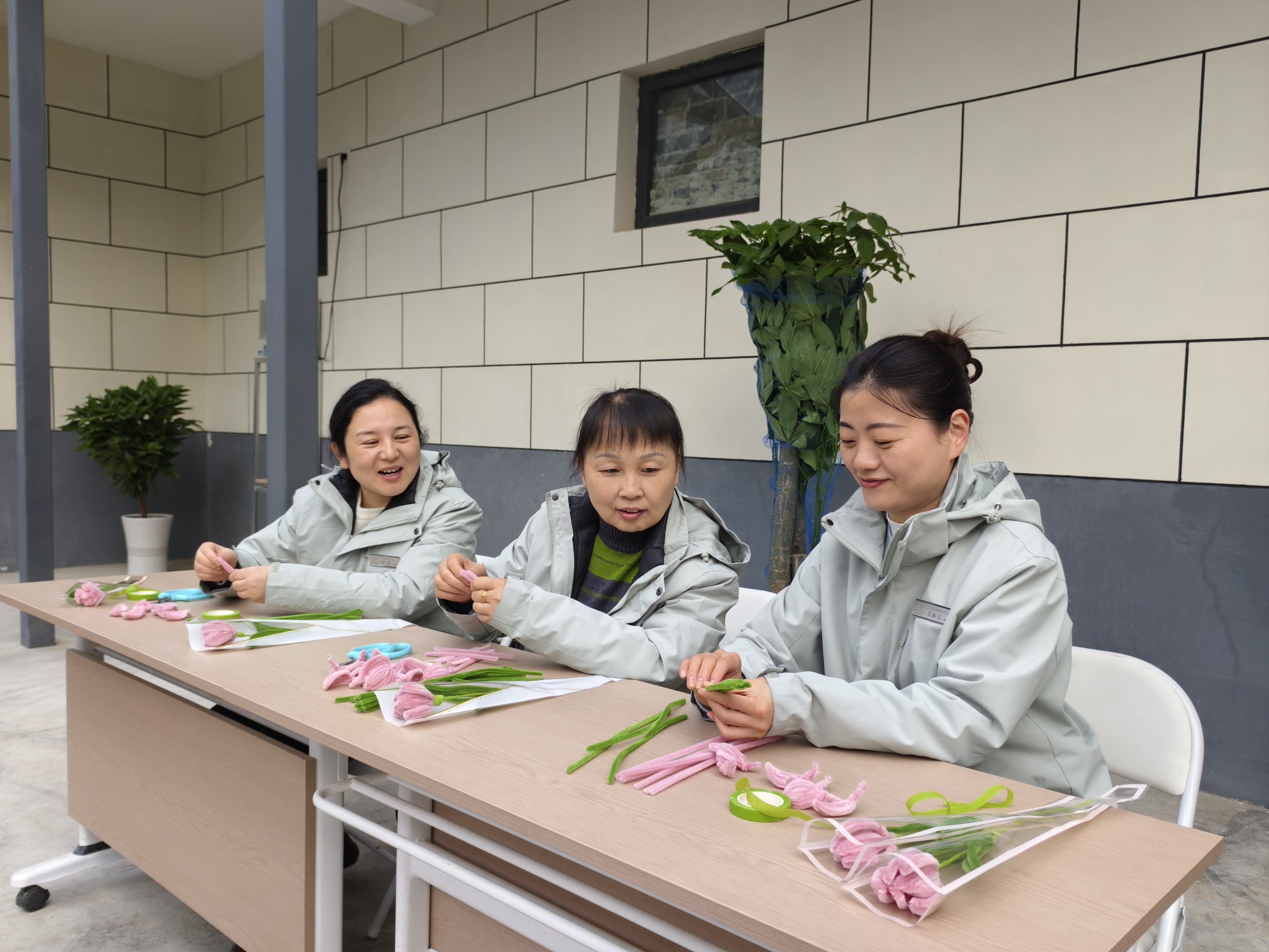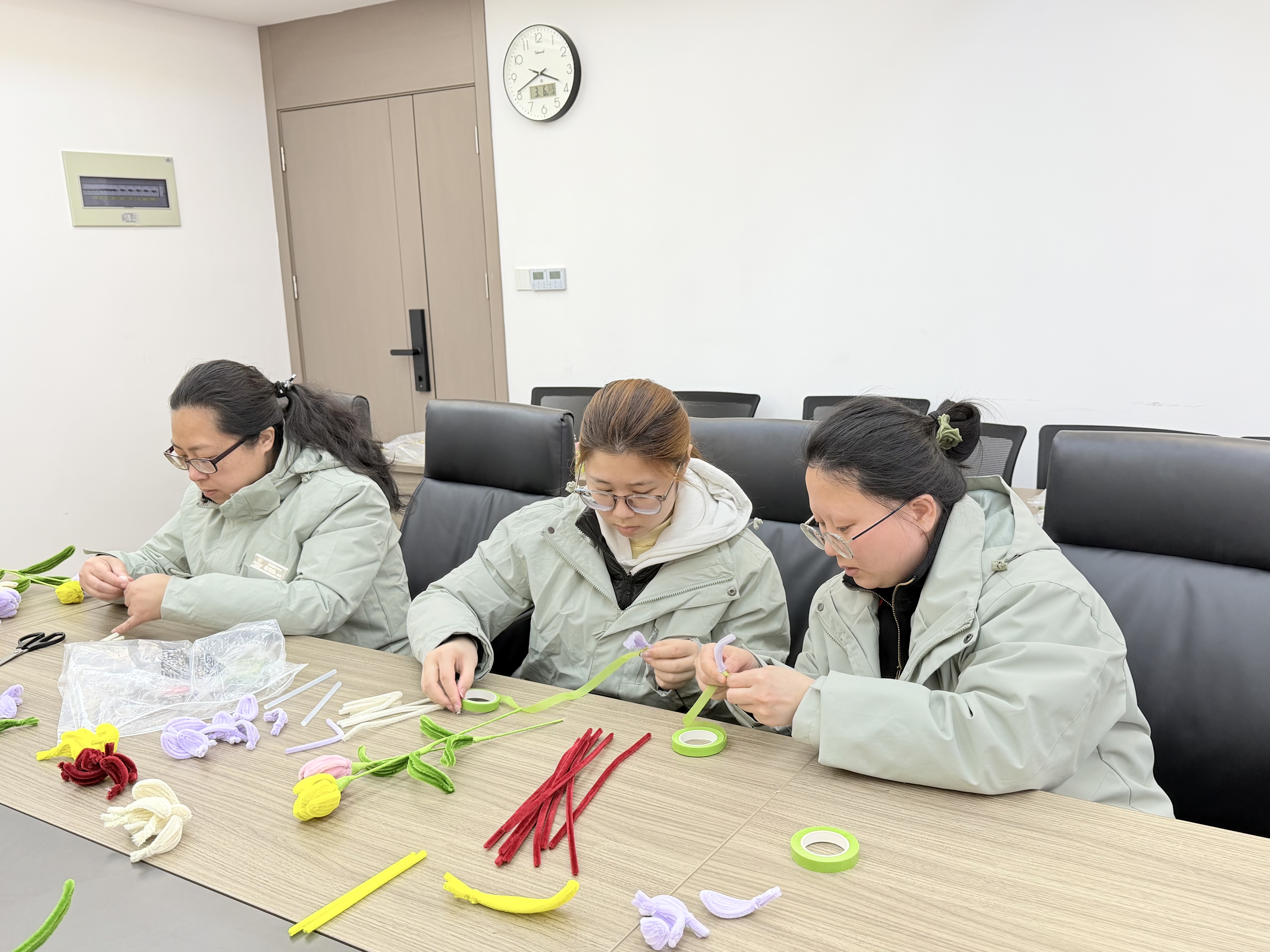 平日里,她们是坚守在校园服务一线的“巾帼力量”,在后勤保障、师生服务的岗位上,细致严谨、默默坚守。此时,她们暂时放下忙碌的工作,褪去职场的干练,化身灵动的“巧手匠人”,在轻松愉悦的氛围中,尽情释放心底的温柔与创意。大家围坐在一起,或认真模仿、细细琢磨,或大胆发挥、创意十足,时而轻声交流制作技巧,时而互相帮忙调整花型、整理叶片,你一言我一语,温馨又热闹。指尖生花,匠心藏暖,一根根普通的扭扭棒,在女同胞们的指尖翻飞间,不多时,一朵朵郁金香在巧手中渐次绽放,被赋予了生机与诗意。