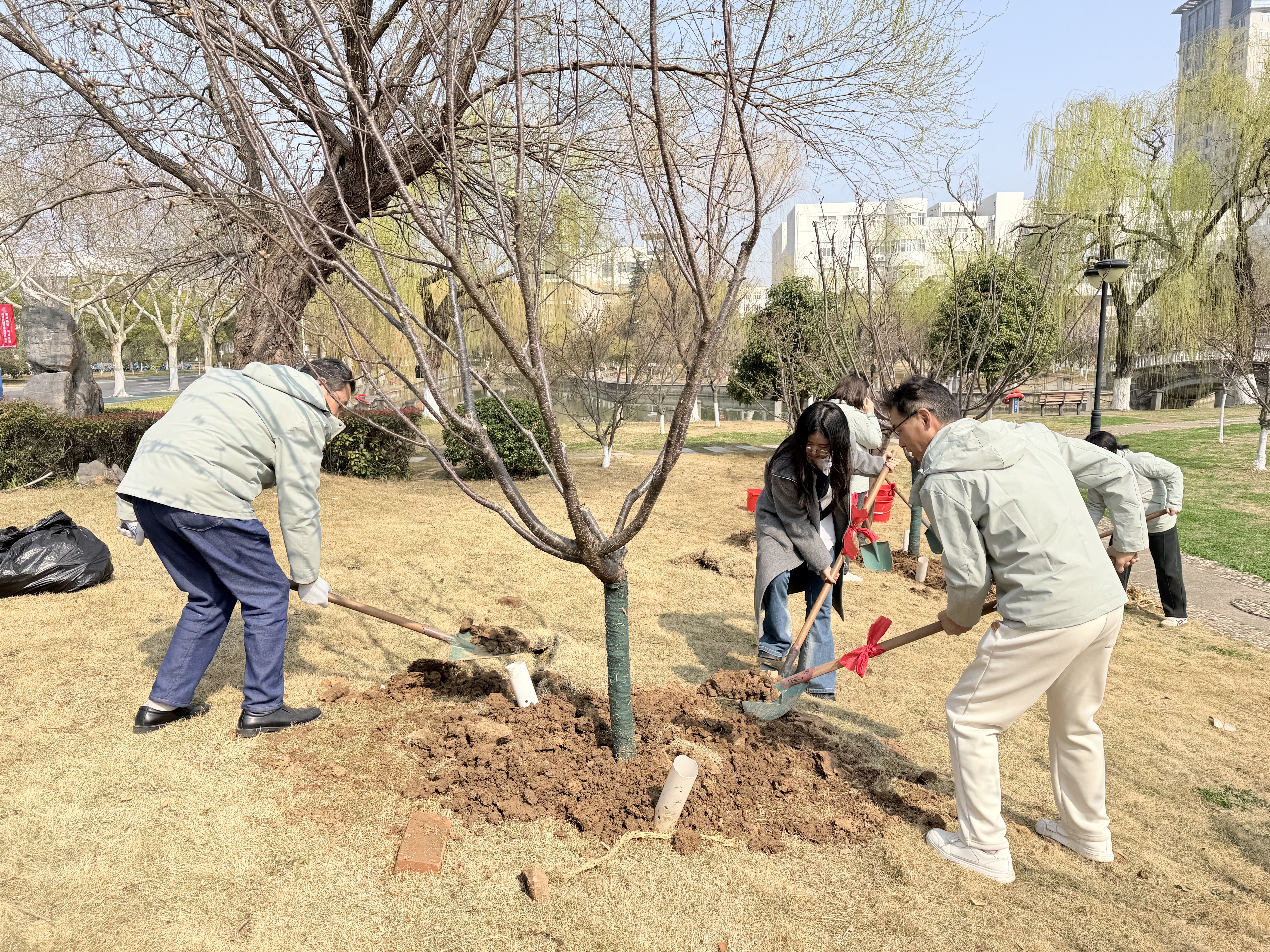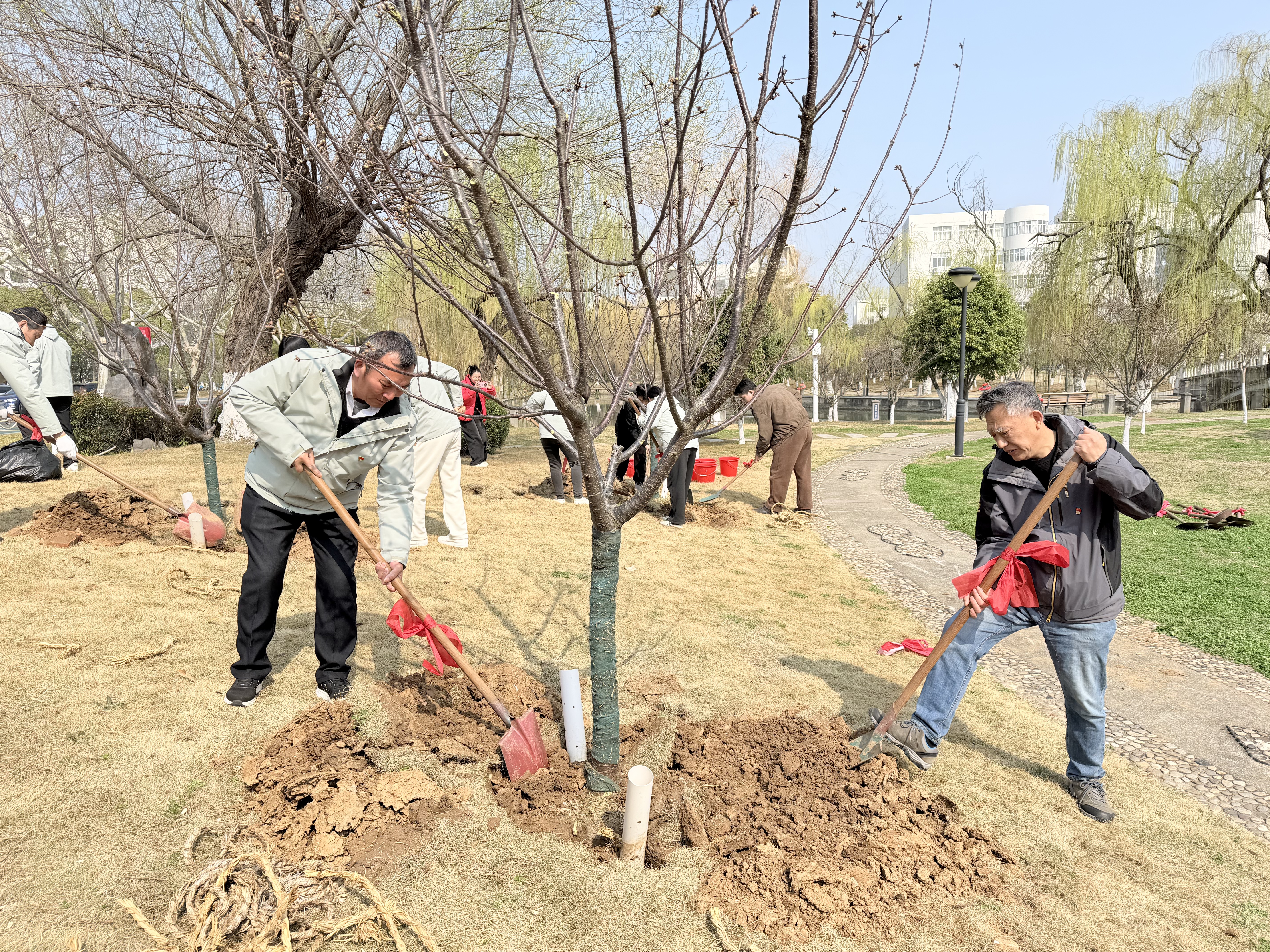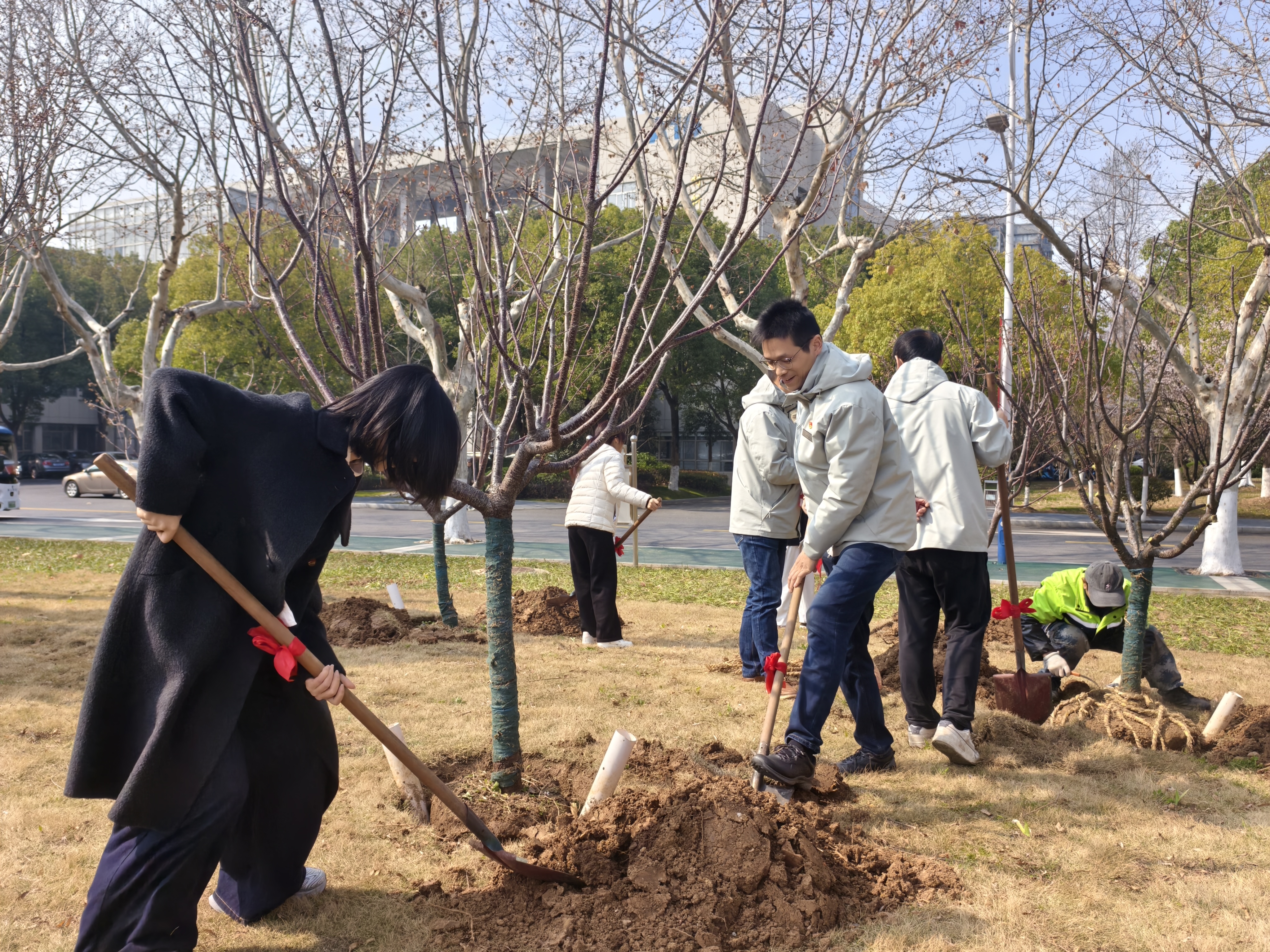 接受任务后,全体人员迅速投入植树劳动。大家分工协作、配合默契,挥锹铲土、扶苗定植、培土压实、提桶浇灌,各环节衔接有序。绿化技术人员全程现场指导,及时答疑解惑。活动现场干劲十足、热火朝天,大家忙碌的身影与春日绿意相映成趣,构成一幅生动鲜活的劳动画卷。经过共同努力,14 棵红粉佳人樱顺利栽植完成,在春风中焕发生机。