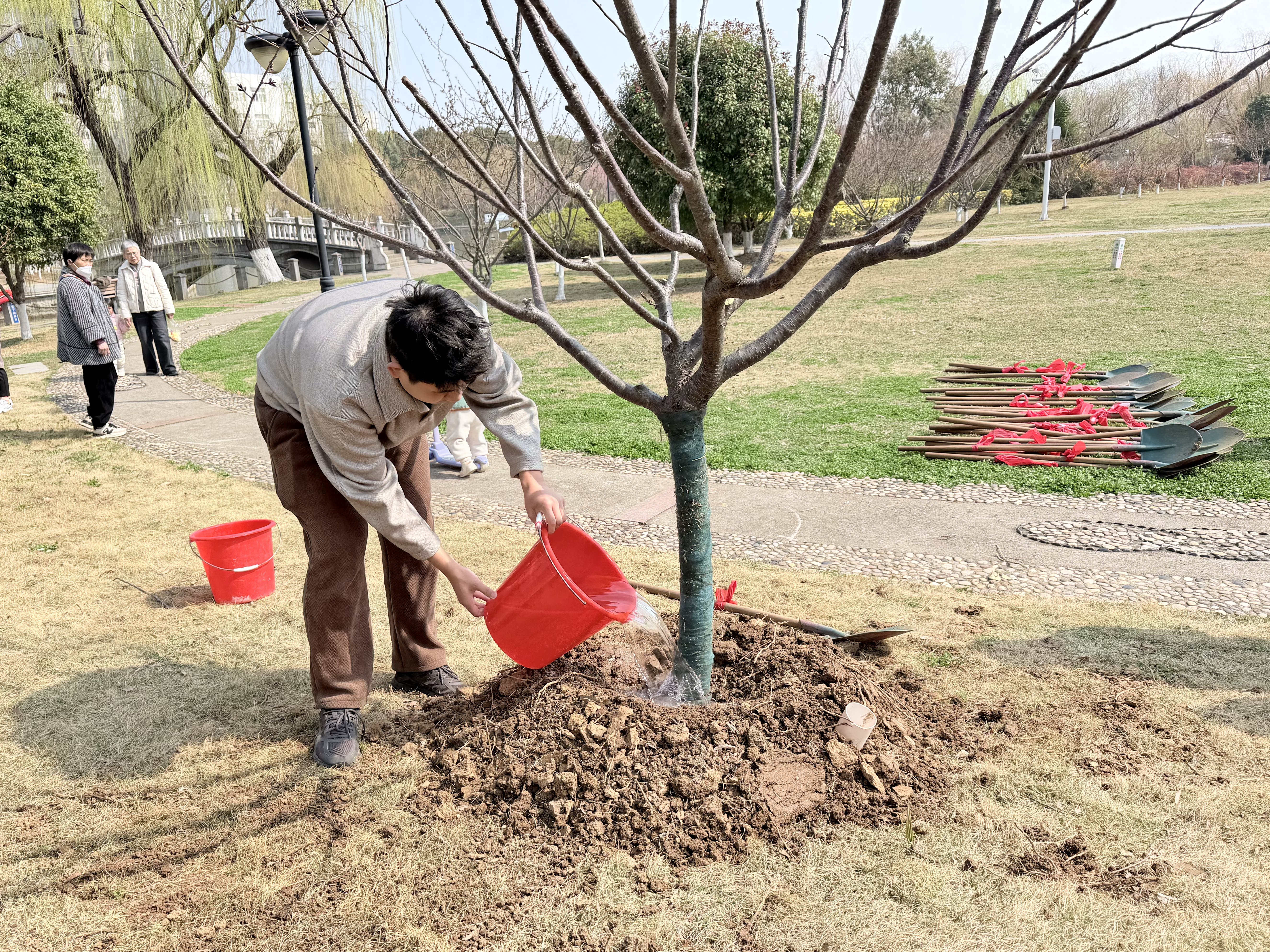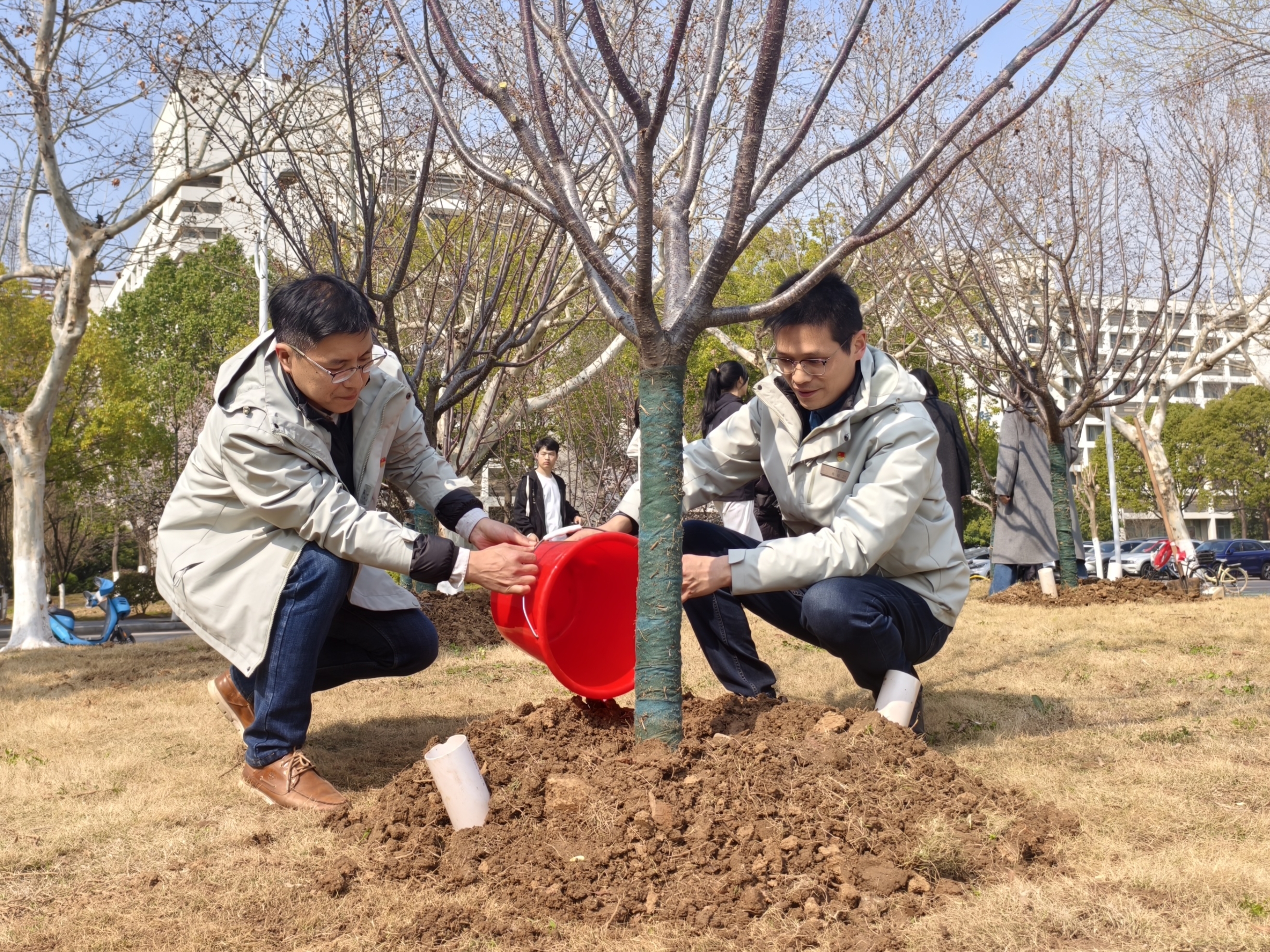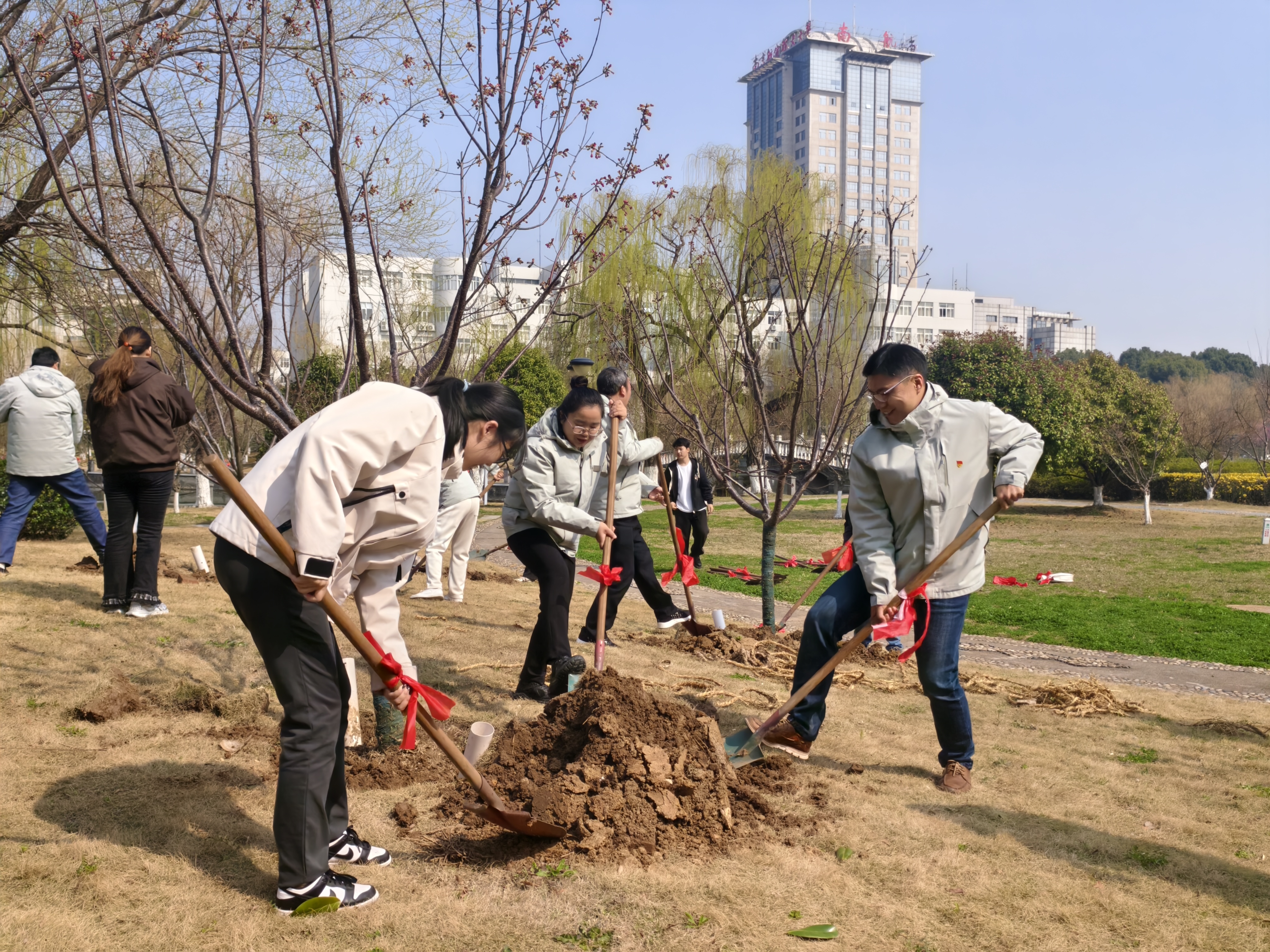 接受任务后,全体人员迅速投入植树劳动。大家分工协作、配合默契,挥锹铲土、扶苗定植、培土压实、提桶浇灌,各环节衔接有序。绿化技术人员全程现场指导,及时答疑解惑。活动现场干劲十足、热火朝天,大家忙碌的身影与春日绿意相映成趣,构成一幅生动鲜活的劳动画卷。经过共同努力,14 棵红粉佳人樱顺利栽植完成,在春风中焕发生机。