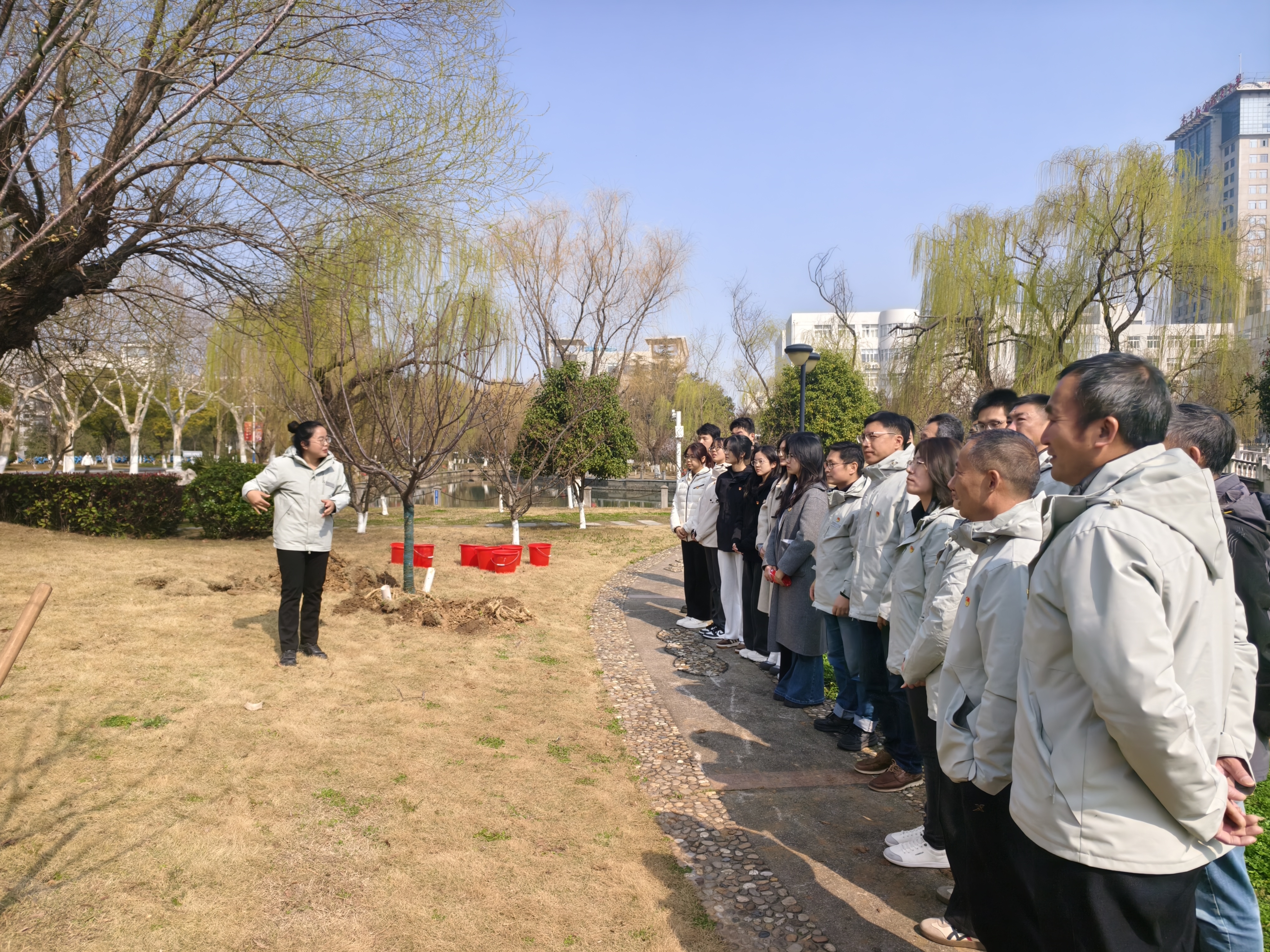 活动伊始,中心技术人员着重介绍此次新引入的红粉佳人樱,与校园常见的染井吉野樱形成品种互补,进一步丰富校园景观层次,着力打造砚湖特色景观带。随后,详细讲解了苗木栽植流程与操作技巧,帮助大家快速掌握植树要点,确保栽植规范、成活良好,为后续校园绿化养护工作打下坚实基础。